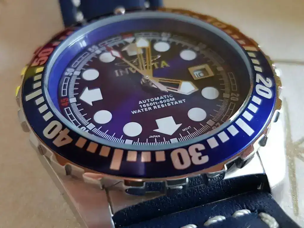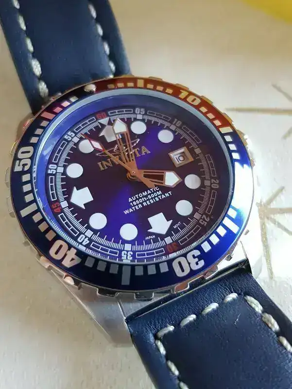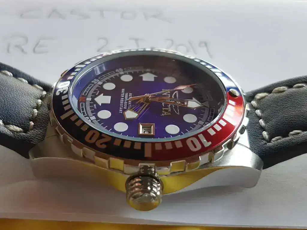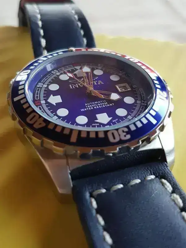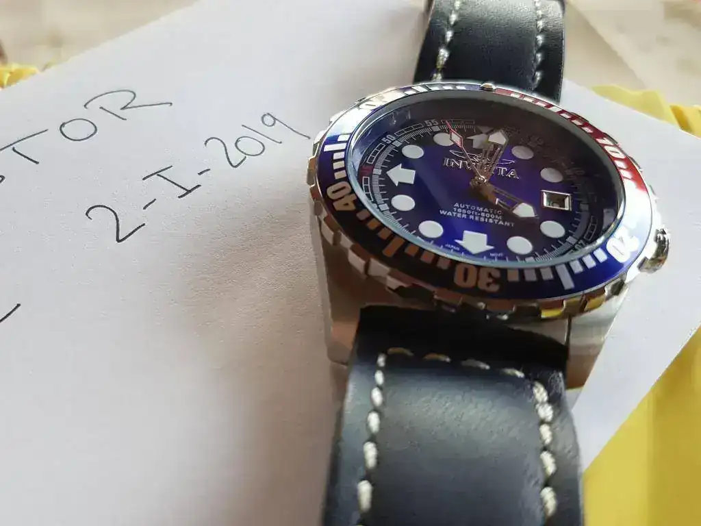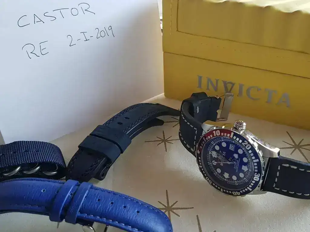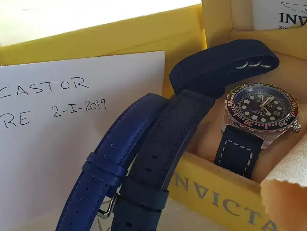 La correa original pasó a mejor vida y se sustituyó por una correa de BOB azul a la que se le montó la hebilla original (firmada). Se incluye una correa original Invicta de la marca Lorica en azul más claro y con sistema de cambio rápido. Esta Lorica tiene la particularidad de ser mojable. También incluyo una correa de MEYHOFFER de ante azul hidrofóbica (también mojable). Por último, una zulú azul a la que le corté la pieza corta para lucirla al estilo RAF (no me gusta que la hebilla quede en un lateral).