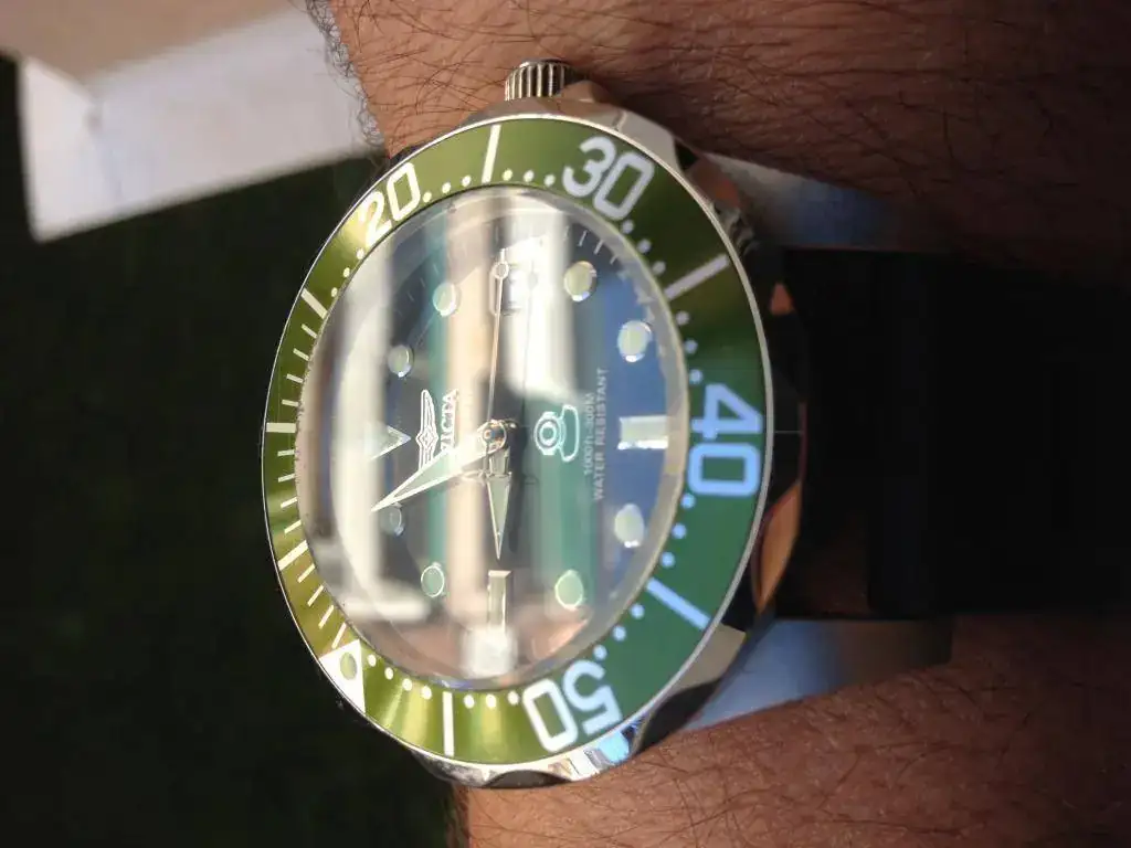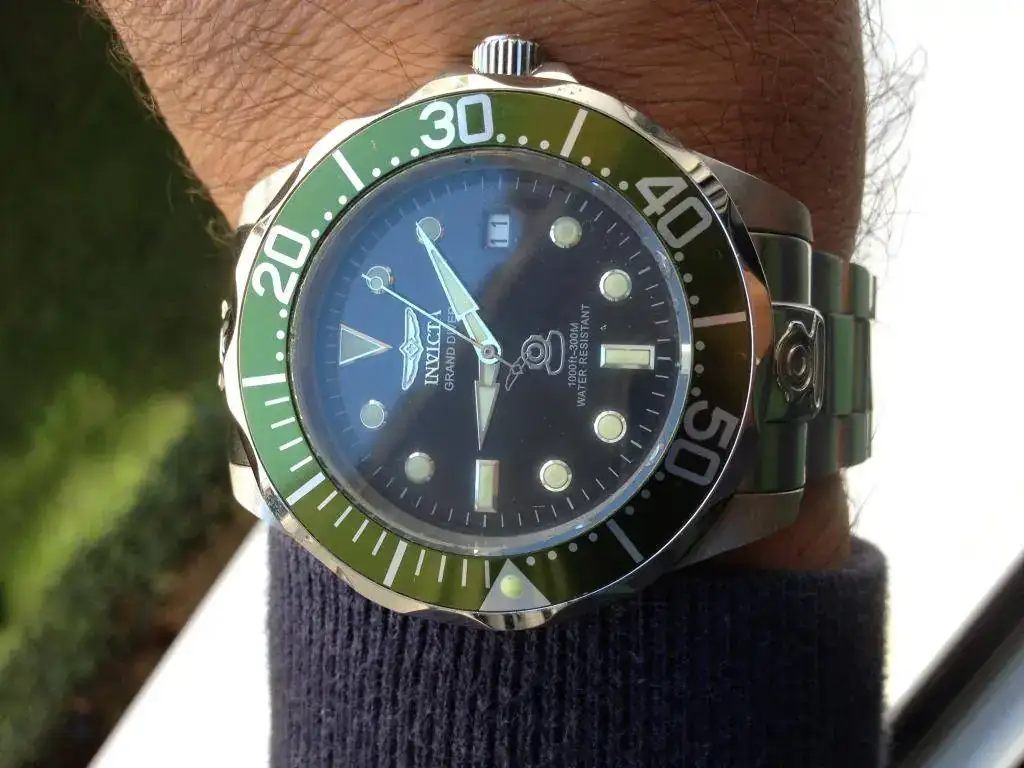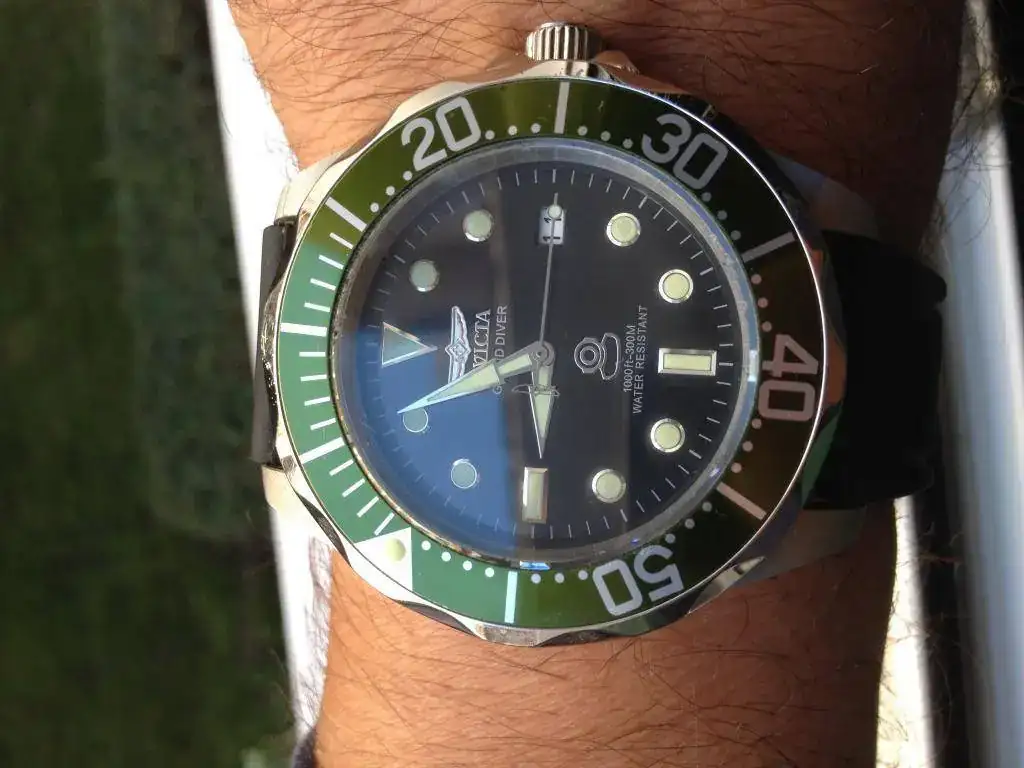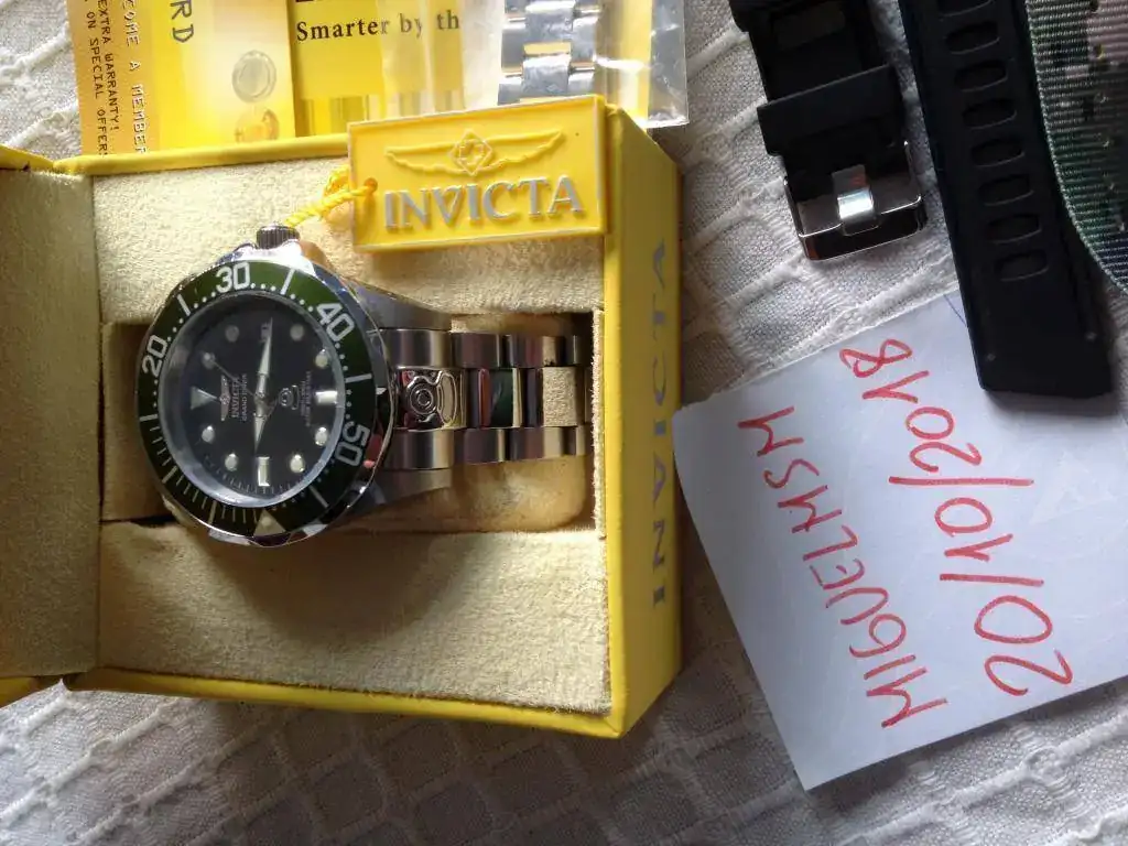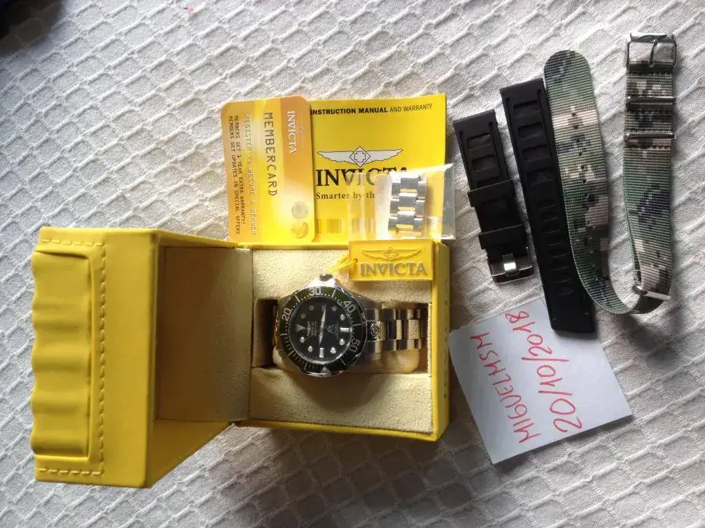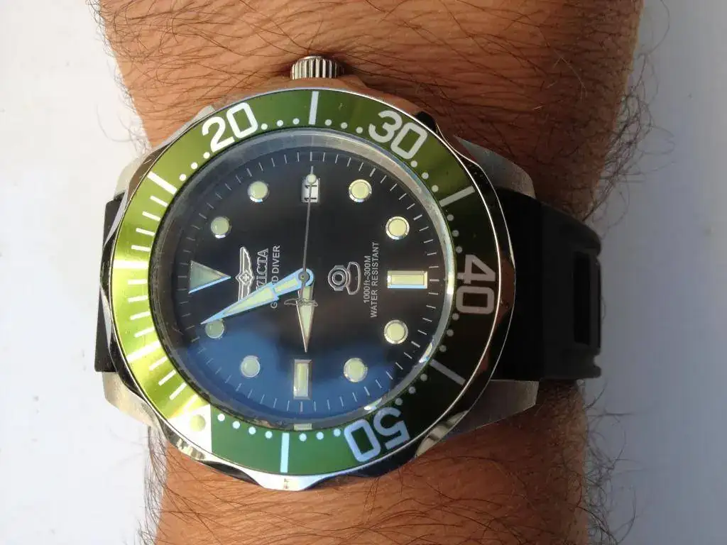 Vendo este Invicta Grand Diver Green 3047, El reloj es de 2016 y ha tenido un uso esporádico. Tiene marcas de uso, a destacar algún pequeño picotazo en el borde del cristal ya que sobresale por encima del bisel. Si lo que buscas es un reloj nuevo, no es el caso, pero si que es un reloj fabuloso de mucha calidad a un precio muy bueno. El funcionamiento del reloj es perfecto y se entrega con dotación completa: Caja, papeles, eslabones sobrantes y garantía (caducada). Se entrega con su armis original, una caucho nuevo negro tipo Isofrán y una correa nato de camuflaje nueva.