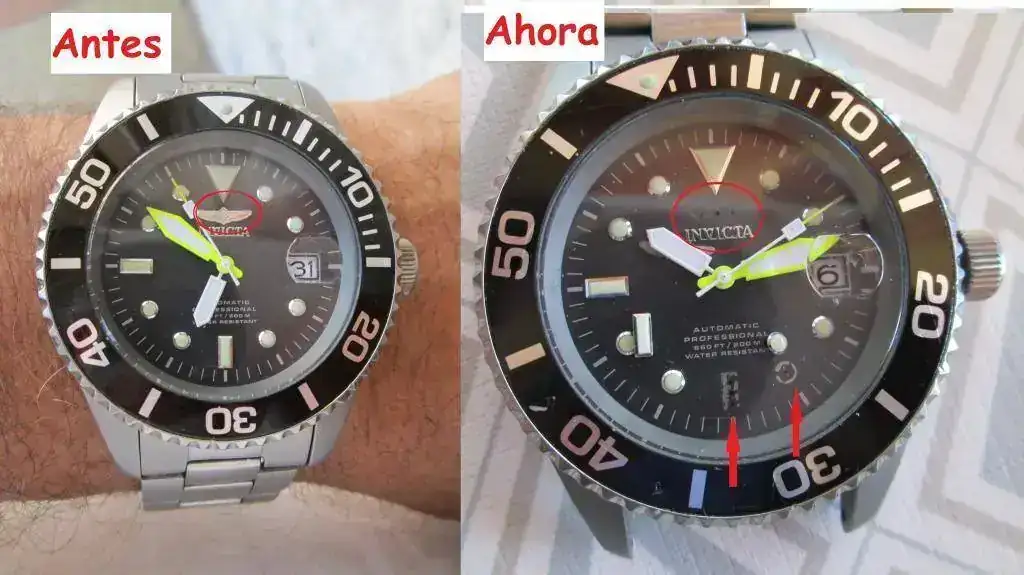 Al estar las ancoras en la barcaza tuve que cortar con la radial las viejas cadenas y la vibración de la máquina de disco acabó por hacer saltar dos índices de la esfera y unas alas al estilo Longines que hay sobre el logo de Invicta, y eso no es todo, al bajar las nuevas cadenas por la borda una de ellas me rozó el armis arrancando el reloj de la muñeca y cayendo al mar con la suerte que se trataba de un fondo arenoso a poca profundidad (7 mts) y lo localizé enseguida.