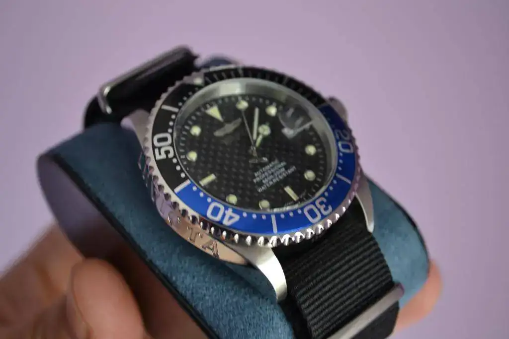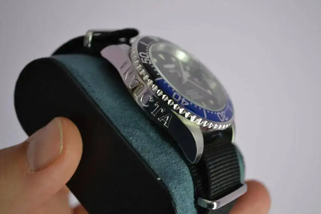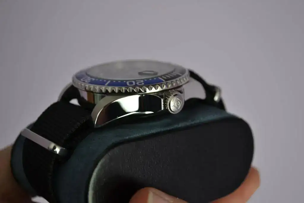Bisel unidireccional azul y negro, muy bonito pero durísimo de accionar, como todos los de la marca. Os podéis hacer una idea del tamaño por las fotos, en mi muñeca de 19-19,5 cm