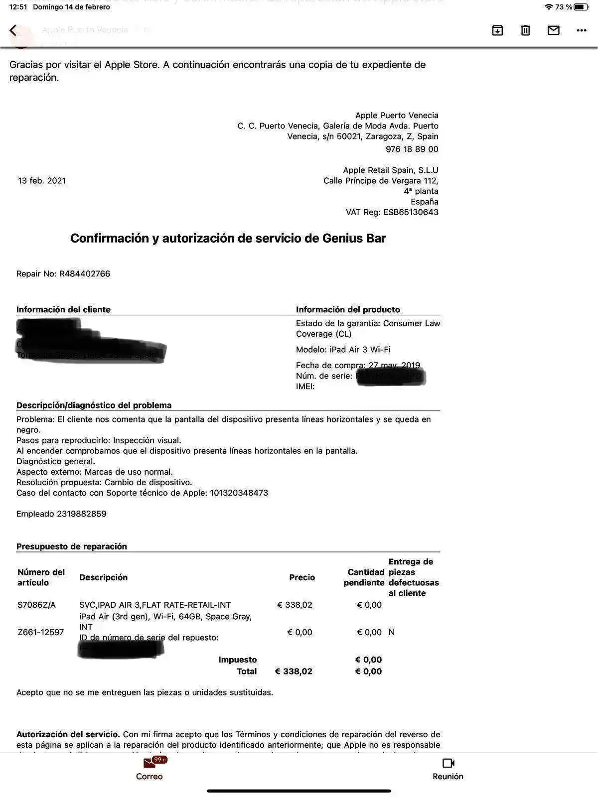 Entrego ticket de compra original (de Apple store) y el documento que acredita el cambio de terminal por uno nuevo con fecha 13 de febrero.