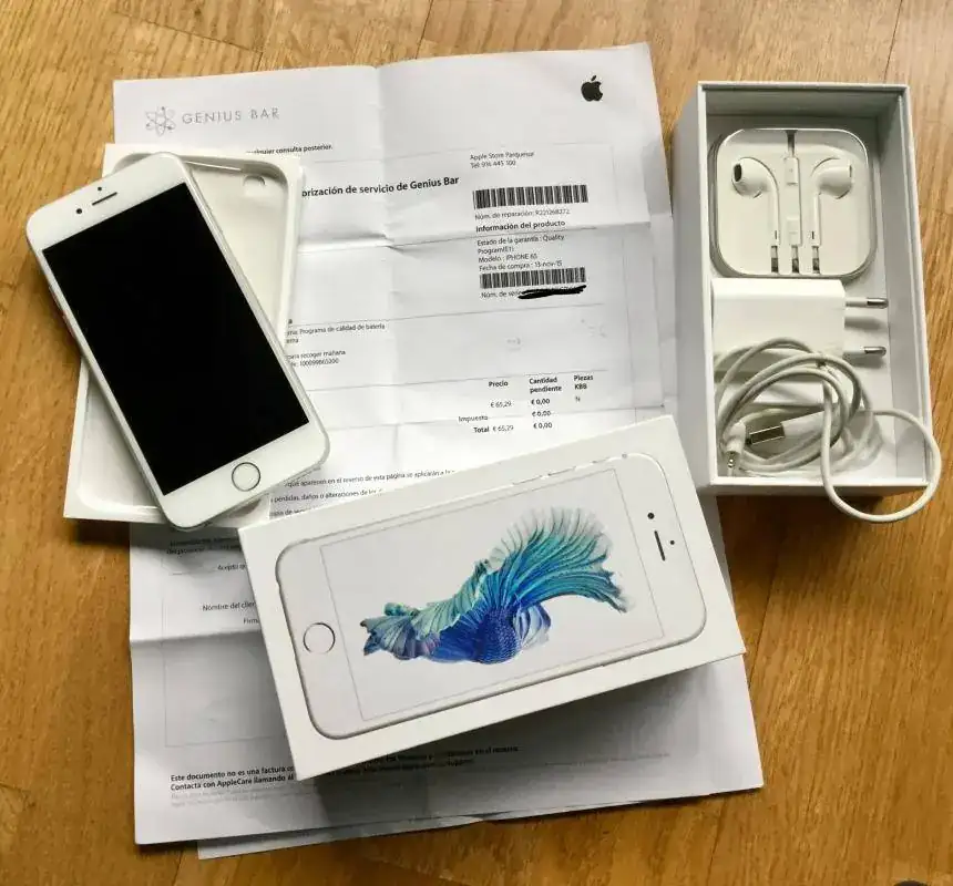 Viene con su caja y demás accesorios que venían de origen a excepción del cable que perdí en un viaje y lo repuse por otro no original pero de calidad. Incluyo una funda genérica azul. En cuanto a los auriculares decir que fueron sacados para probar su calidad de sonido y que regresaron a su cajita por yo disponer de otros de mayor calidad, con lo cual se puede decir que han sido usados aunque prácticamente un solo día.