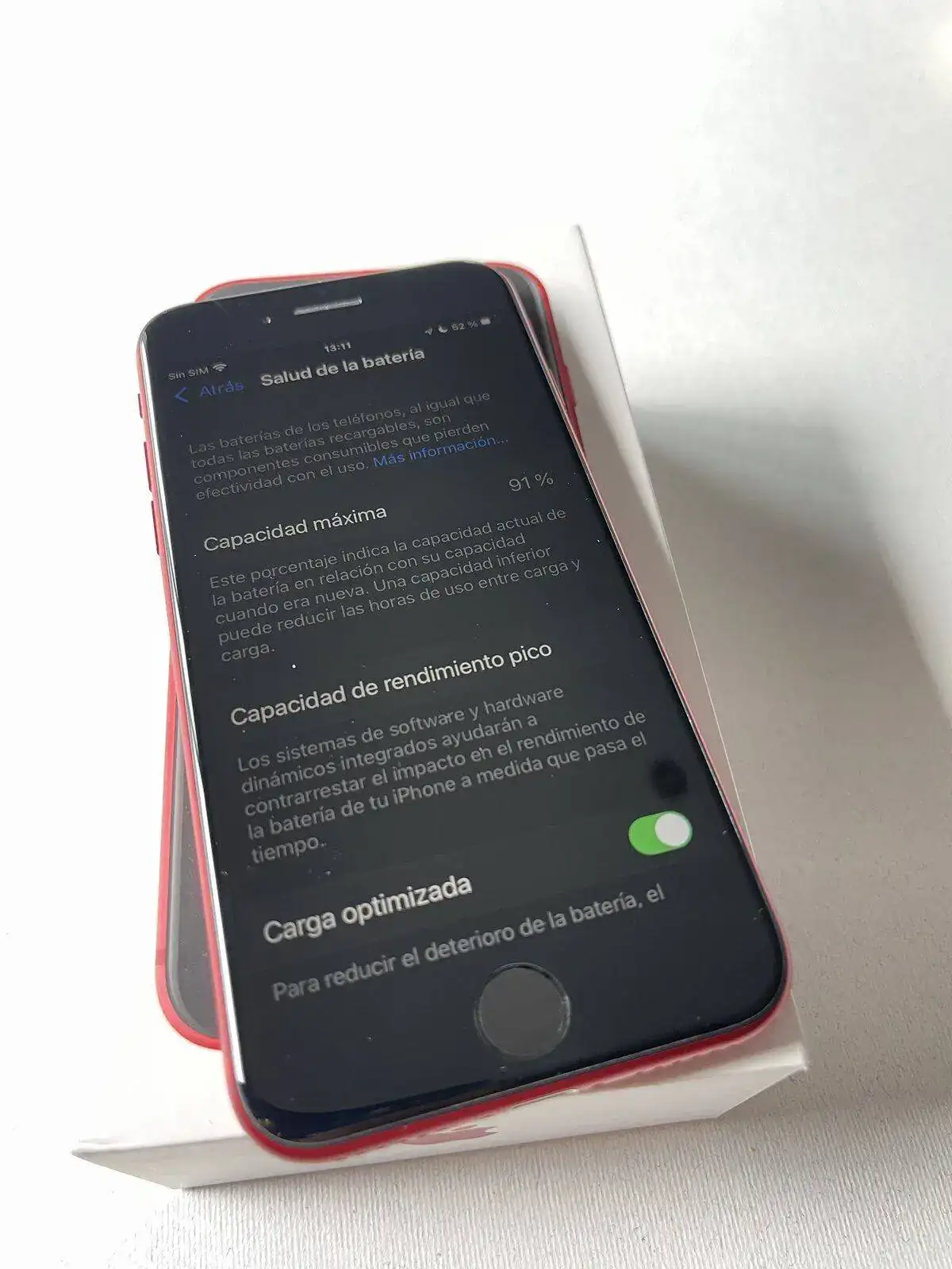 Vendo iPhone SE 2020 (2ª generación) Product Red 64gb, garantía caducada, en muy buen estado general, batería al 91%, pantalla estupenda, sin golpes en ninguna parte del teléfono, ligeras picaditas en los cantos del teléfono fruto de llevarlo siempre con funda que por contra resultan prácticamente inevitables, una pequeña micro raya en la trasera que se puede apreciar en las fotos, hago estos detalles que posiblemente a simple vista no se aprecian, pero yo soy muy obsesivo con la estética…