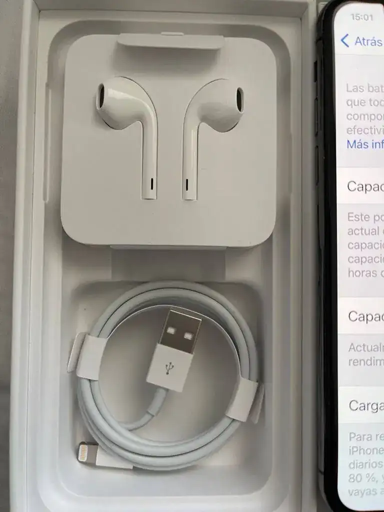 Sin cargador, y con cable de carga u auriculares a estrenar..