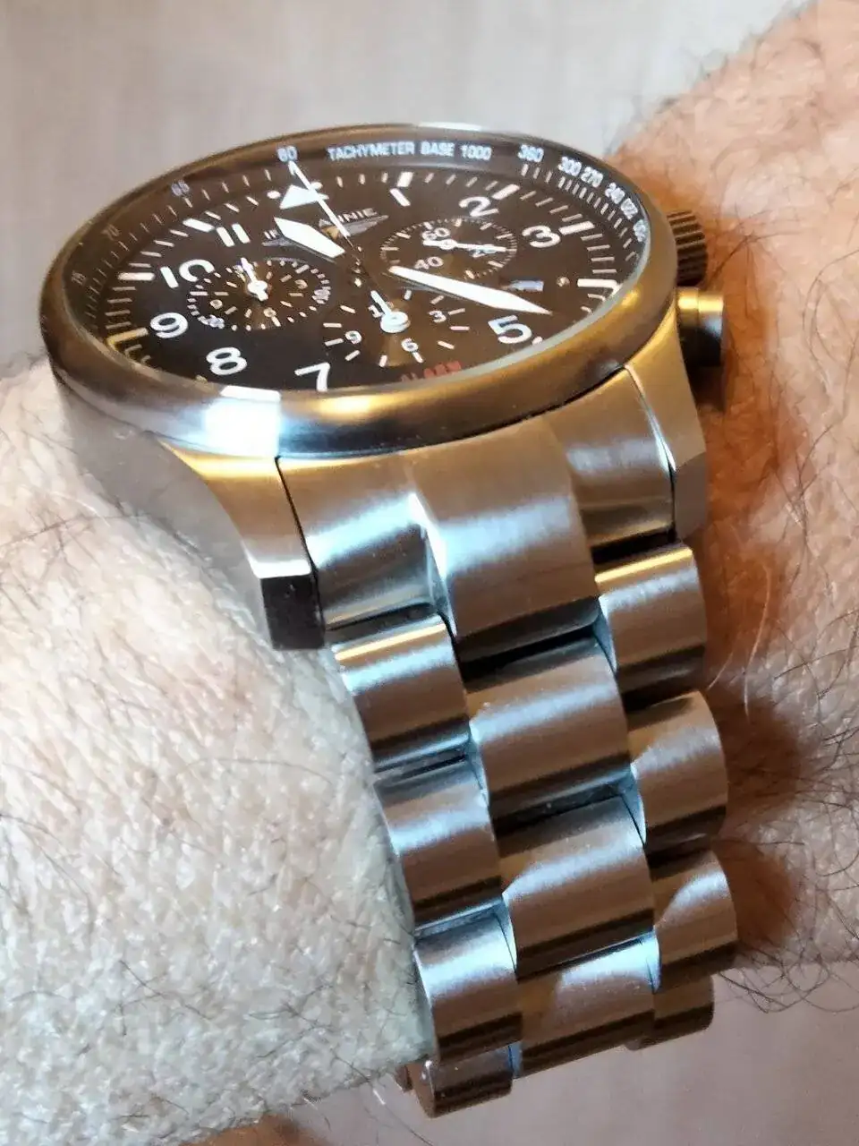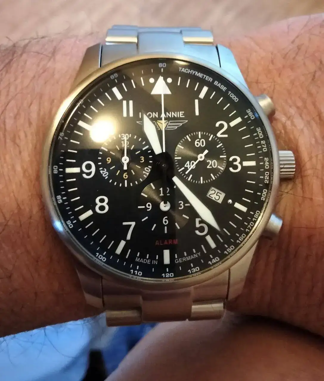 Buenos días amigos, buscando un crono negro y de cuarzo fui a ver el Bulova Lunar Pilot, en mano no me convenció nada y menos por los 570E que cuesta. Al final descubrí este Iron Annie, el doble de resistencia al agua que el Bulova y cuesta la mitad, tiene alarma y el cristal es mineral pero es abombado que nunca he tenido uno así y me encanta. Después de pensarlo un poco lo compré, 299E tiene calibre Ronda 5030d. Que opináis? Conocéis la marca? Y el calibre?