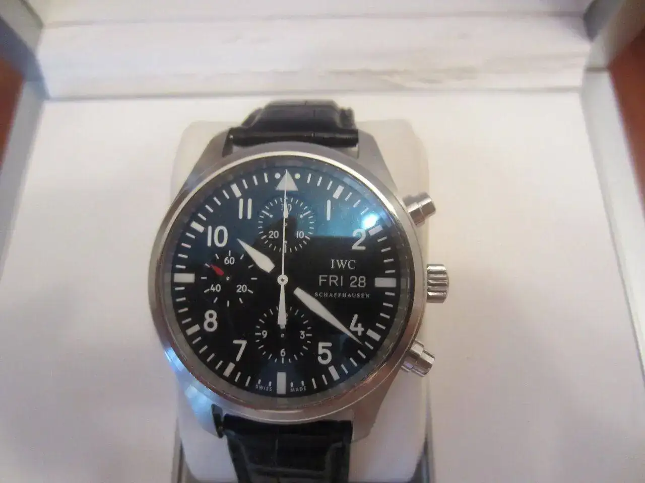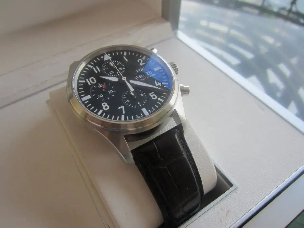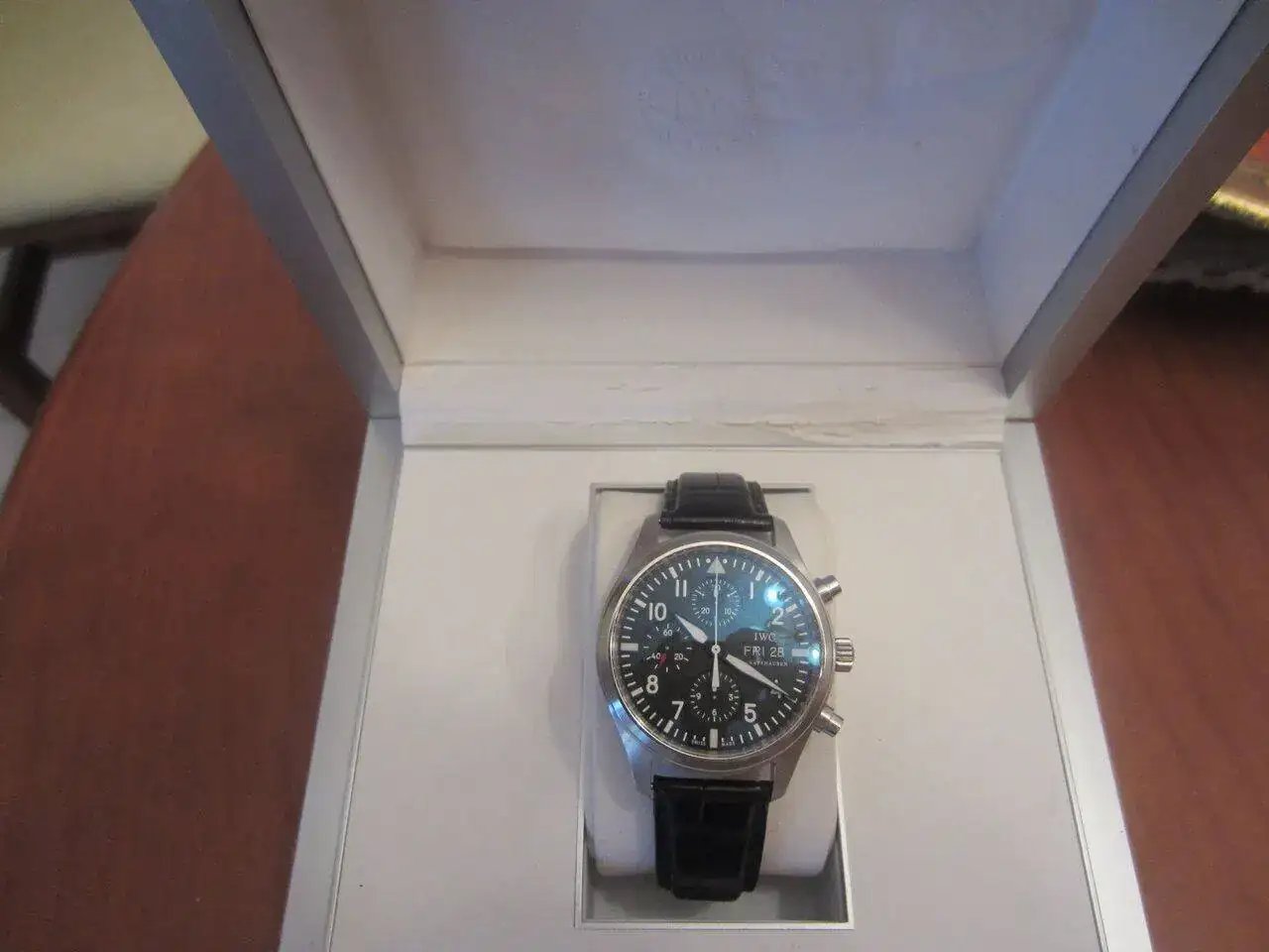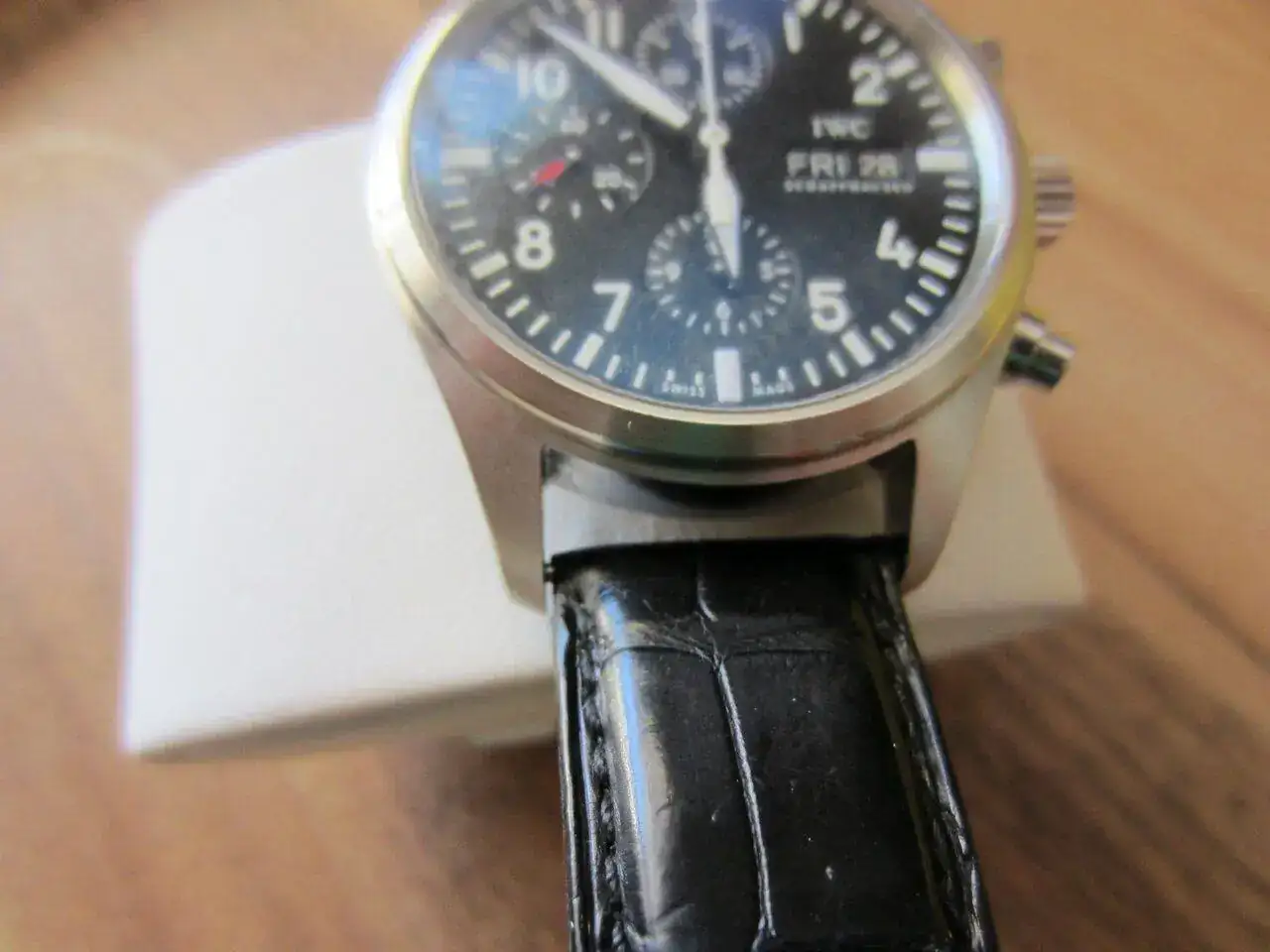 Hola, saco a la venta mi IWC Pilot Chrono , el estado es bastante bueno ya que apenas lo he usado desde que lo compré de 2ª mano en 2014, decir que tiene un pequeño picotazo apenas apreciable entre las 6h y 7 h , el resto , si acaso y por si no se aprecia en las fotos no tiene marcas de uso. La goma de la caja se puso pegajosa y lo limpié , se aprecia que no está perfecta. Si me interesa cambio por un Panerai negro de 44mm (no radomir).