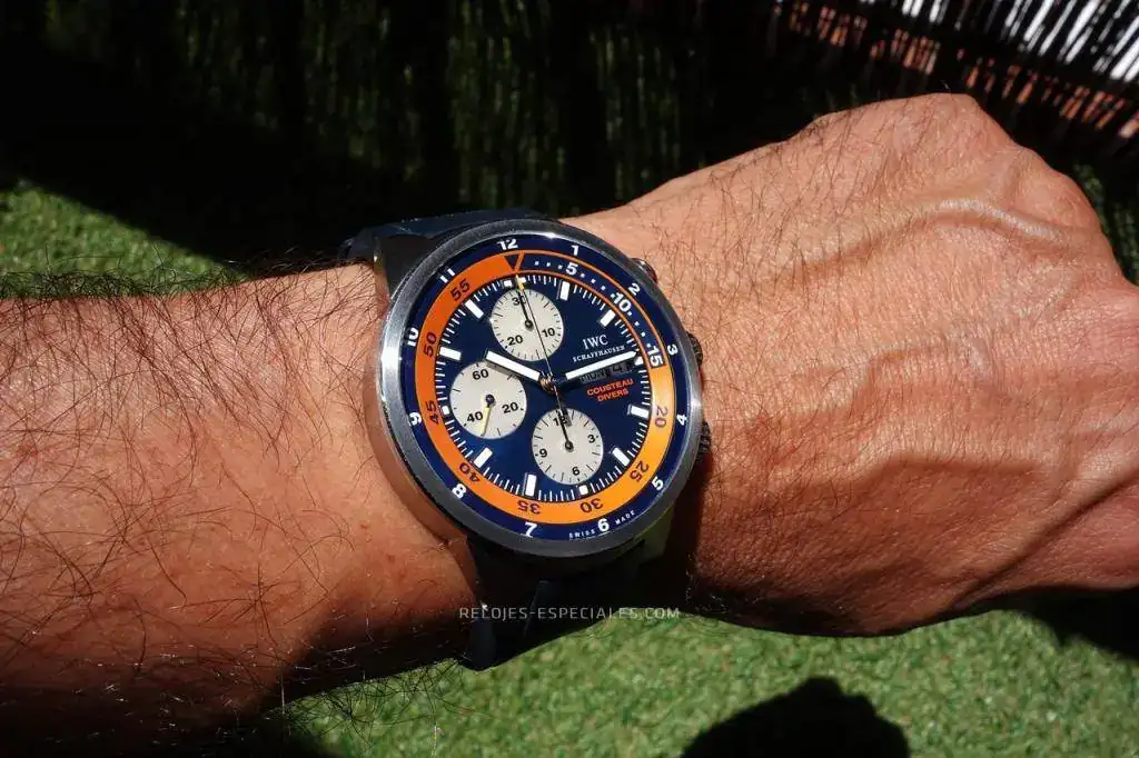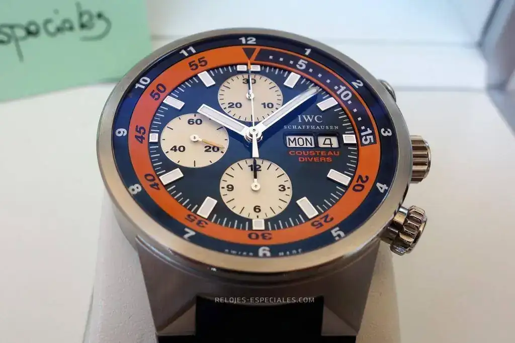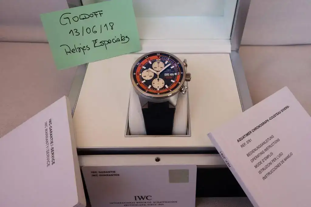 Siguiendo con el "adelgazamiento" de la caja (o, mejor, en el intento) propongo uno de los relojes más bonitos que he tenido: El IWC Aquatimer Cousteau Chrono Divers, edición limitada a 2500 ejemplares. Para los maniáticos: el número de esta unidad no llega al medio millar. Su estado es próximo a nuevo a pesar de que es de 2013, como atestigua la tarjeta de garantía, que no tiene sello de concesionario (importa poco porque la garantía está vencida), pero lo atestiguan mejor las fotos que se acompañan. Ni siquiera el caucho presenta marcas.