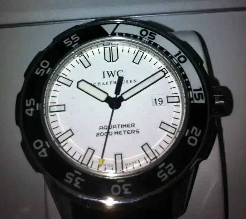 Es un Aquatimer de los nuevos.Caja de acero de 44 mm,corona y tapa roscadas,cristal mineral,bisel giratorio unidireccional a 120 clicks.En su interior un calibre automático que anda en parámetros cosc,más o menos,y una W.R de 2000 metros.