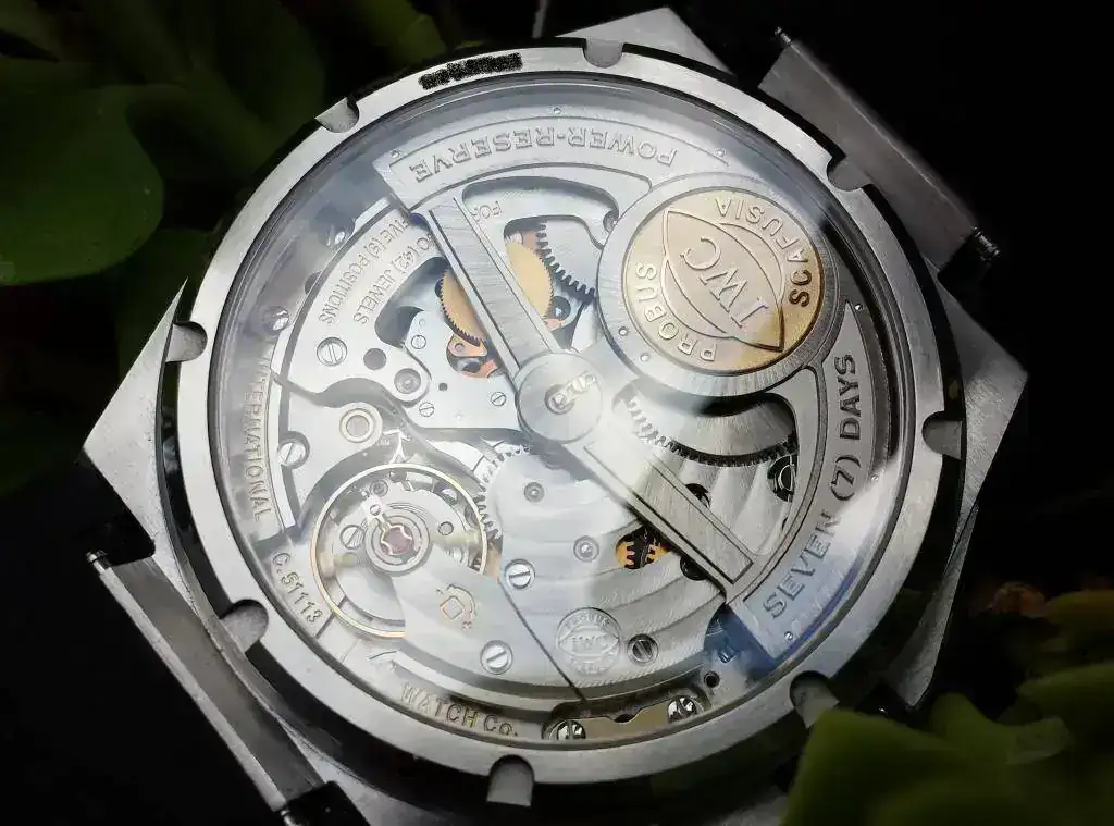 El calibre es una obra maestra. Es de carga automática, con volante Glucydur en aleación de berilio y espiral Breguet. El sistema de cuerda automática Pellaton, patentado por IWC, provee a este reloj 7 días de reserva de marcha. A pesar de que podría continuar activado durante dos días más. El calibre 51113 es el más grande de la familia.