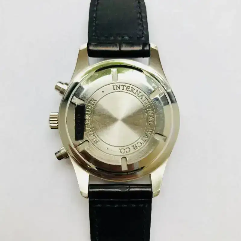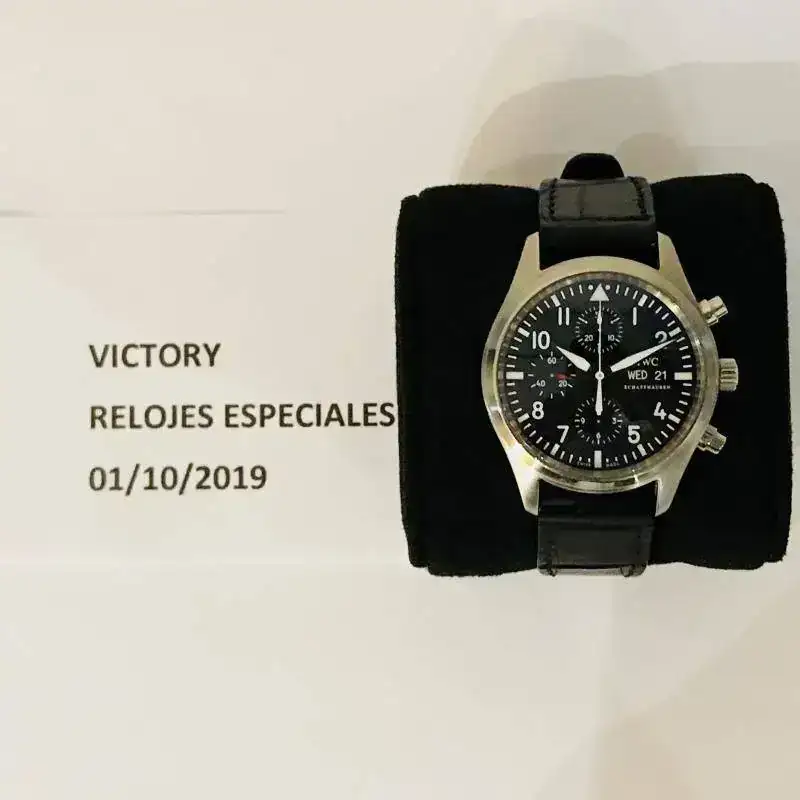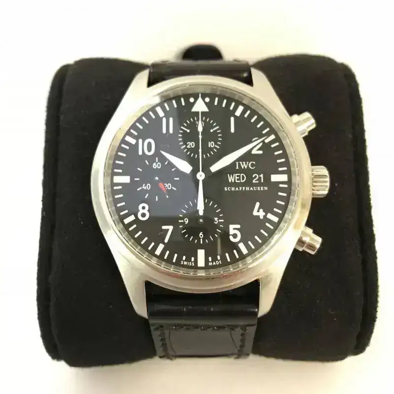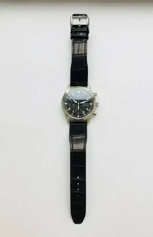 IWC Pilot Chronograph Ref. 3717 de 42mm sin contar la corona, con estuche original de transporte, no dispongo de la documentación original. Tiene una correa artesanal de cocodrilo de JacobStrap para muñecas de 18cm en adelante.