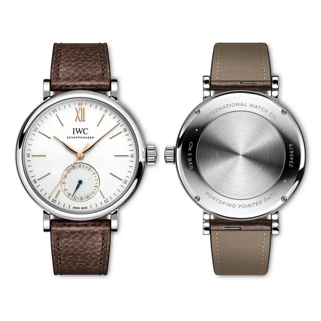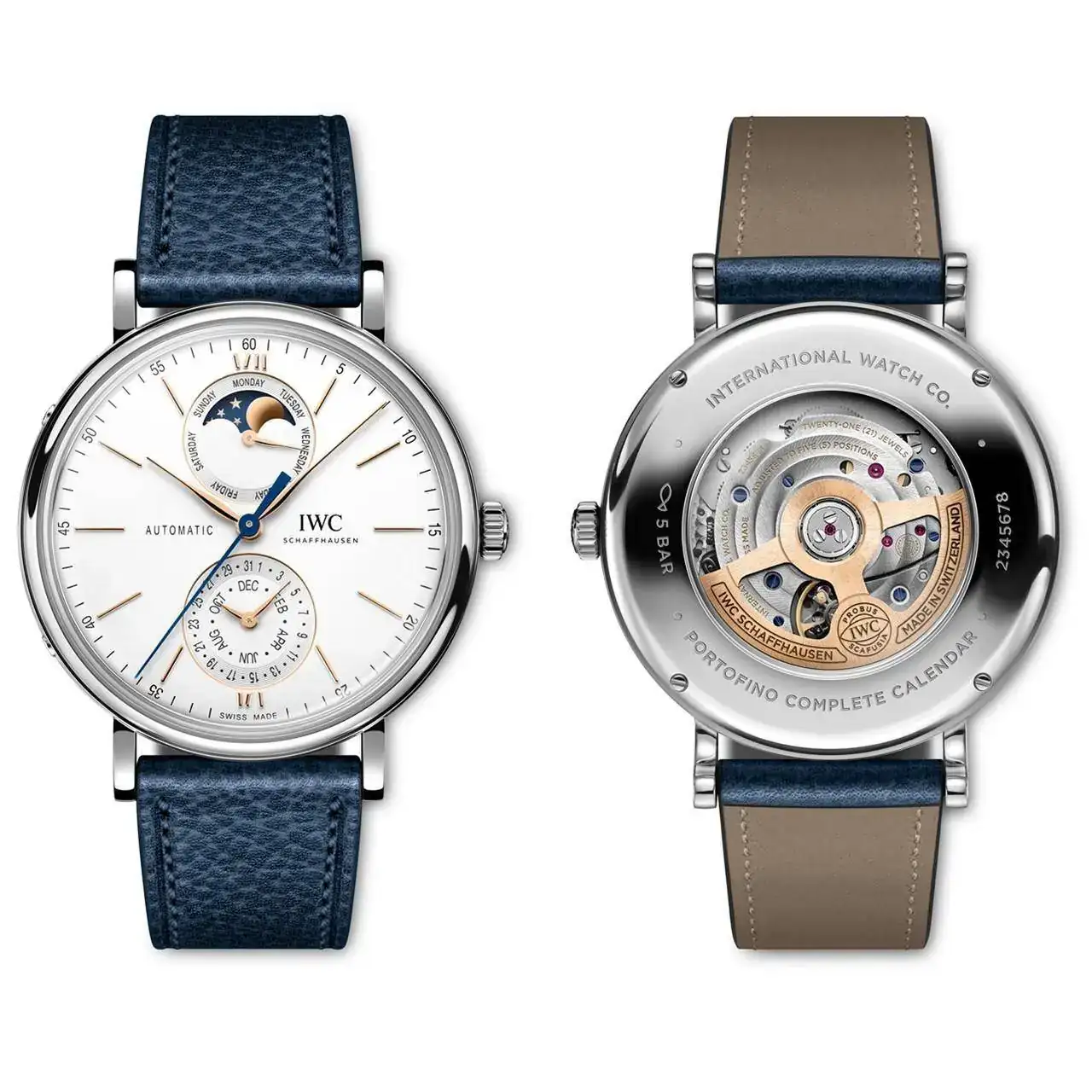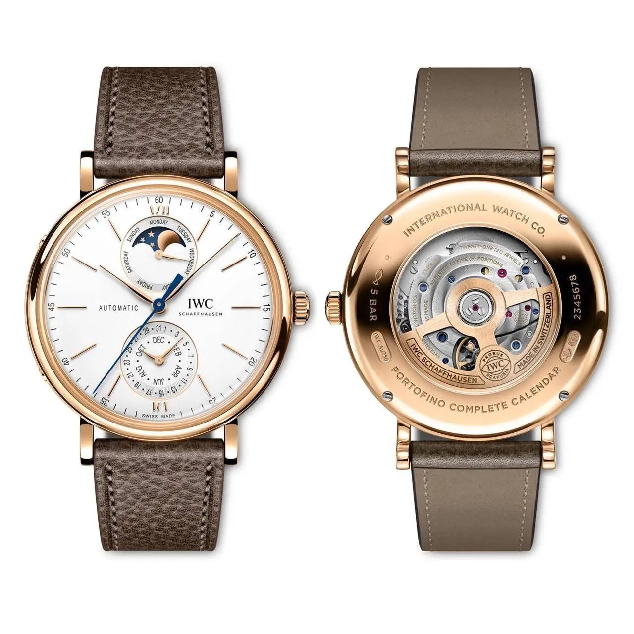 El Portofino Calendario Completo, que se presenta en una caja de oro rojo de 18 quilates o acero inoxidable de 41 milímetros, es el primer reloj de IWC que incorpora el módulo de calendario completo de reciente creación. La subesfera situada a las 12 h muestra el día de la semana y la fase lunar, mientras que la fecha y el mes aparecen a las 6 h.