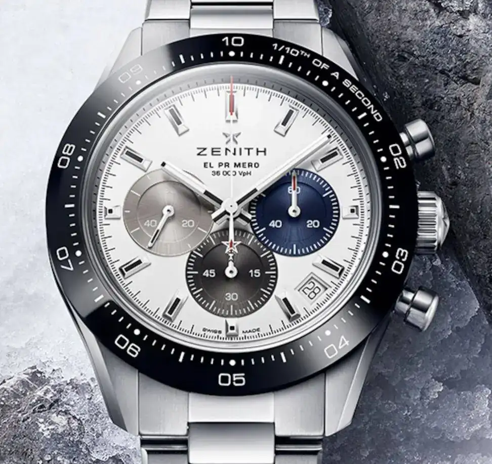 El nuevo movimiento del Zenith El Primero crono usa el indicador que tradicionalmente marca los segundos para marcar las décimas de segundo, así que completa una vuelta en diez segundos (y el bisel está marcado para que leas ahí las décimas, y los minutos y segundos en los subindices).
