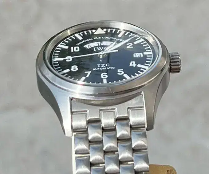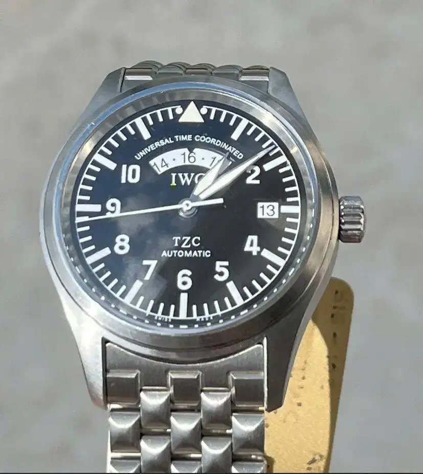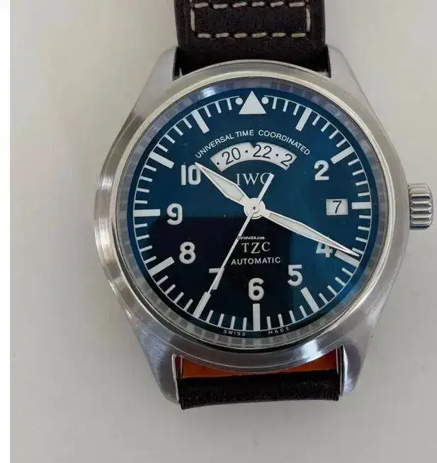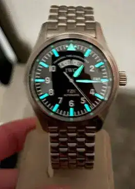 Ando detrás de un IWC UTC 3251 con esfera y agujas de tritio. He localizado uno en buen estado con toda la dotación pero la esfera y las agujas me chirrían un poco. Como veréis en las fotos, pese a indicar “T Made Swiss T” a las 6, el tono de la esfera --triangulo y puntos a las 12-- y las agujas son demasiado blancas para un reloj con tritio. He pedido al vendedor una foto a oscuras tras una exposición a luz intensa y el tono es muy vivo y excesivamente azulado, en lugar de apagado y verdoso o amarillento.
