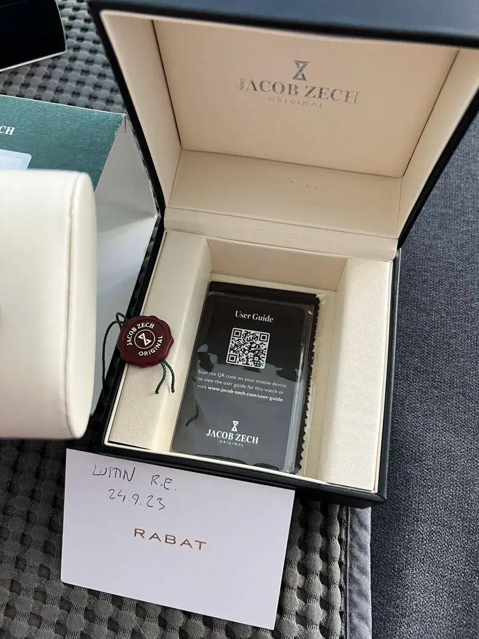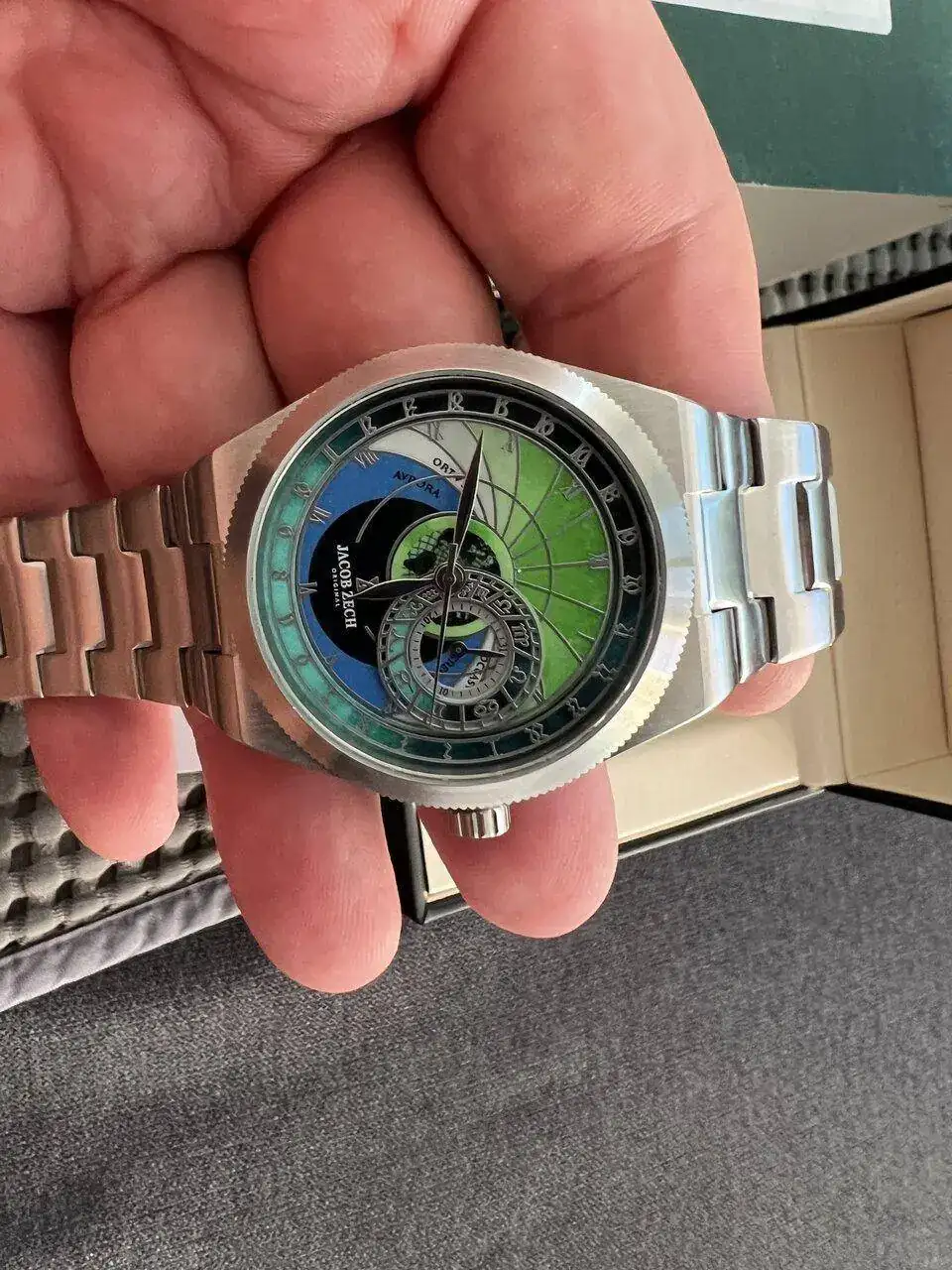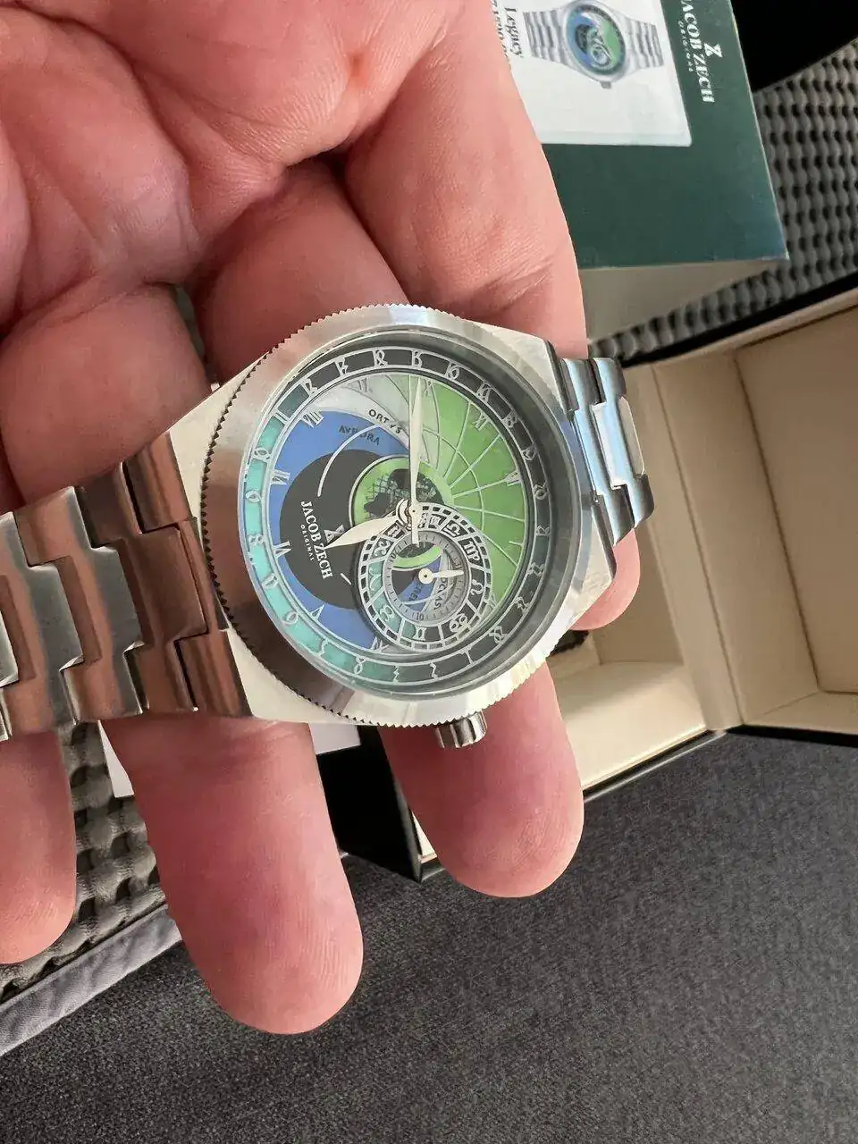 saco a venta este reloj Jacob Zech espectacular, nevo, con toda su documentación; lleva el calibre de Seiko VH65 que funciona casi como si fuera un automático no se ven prácticamente los saltos de aguja a cada segundo