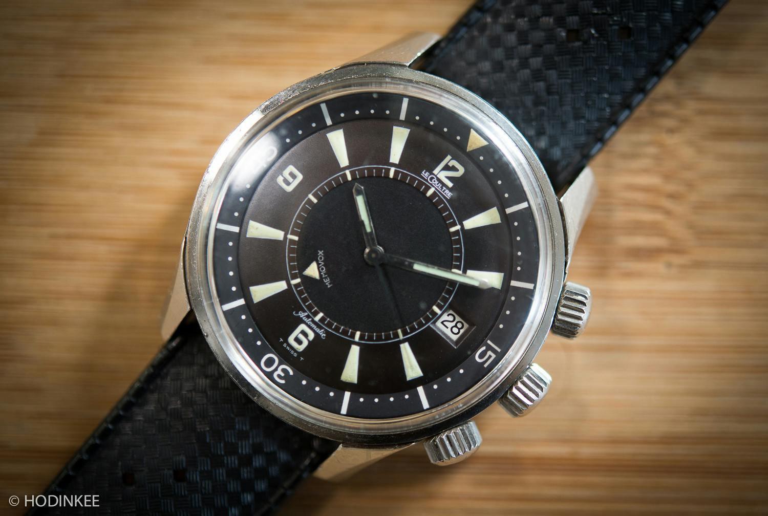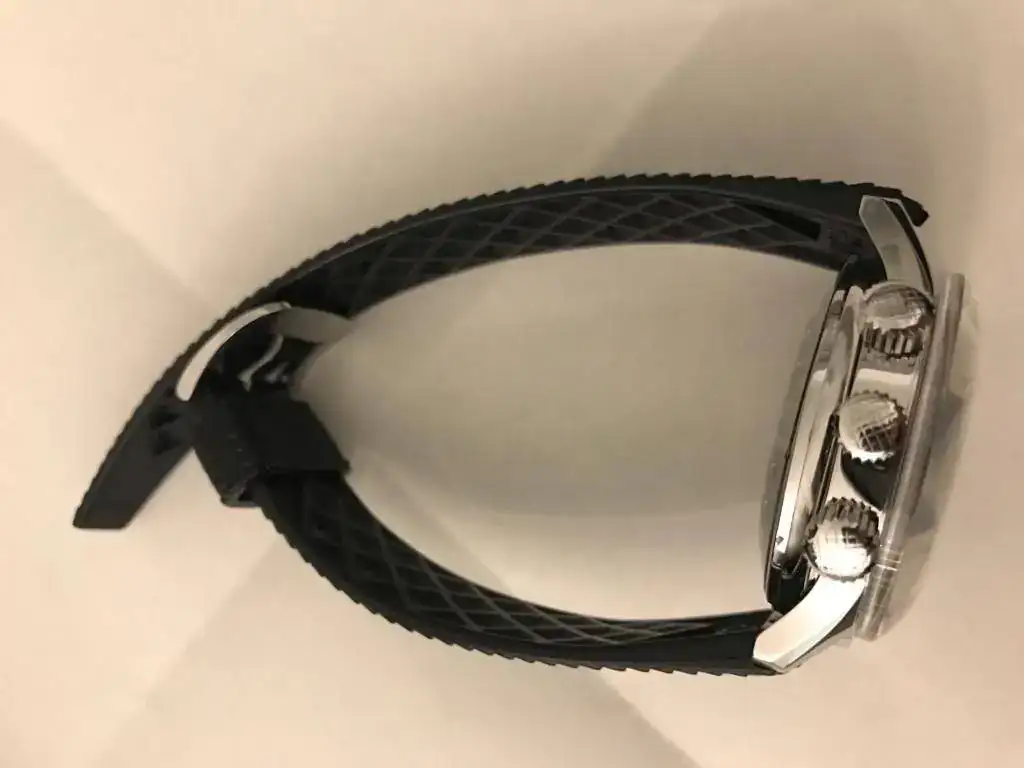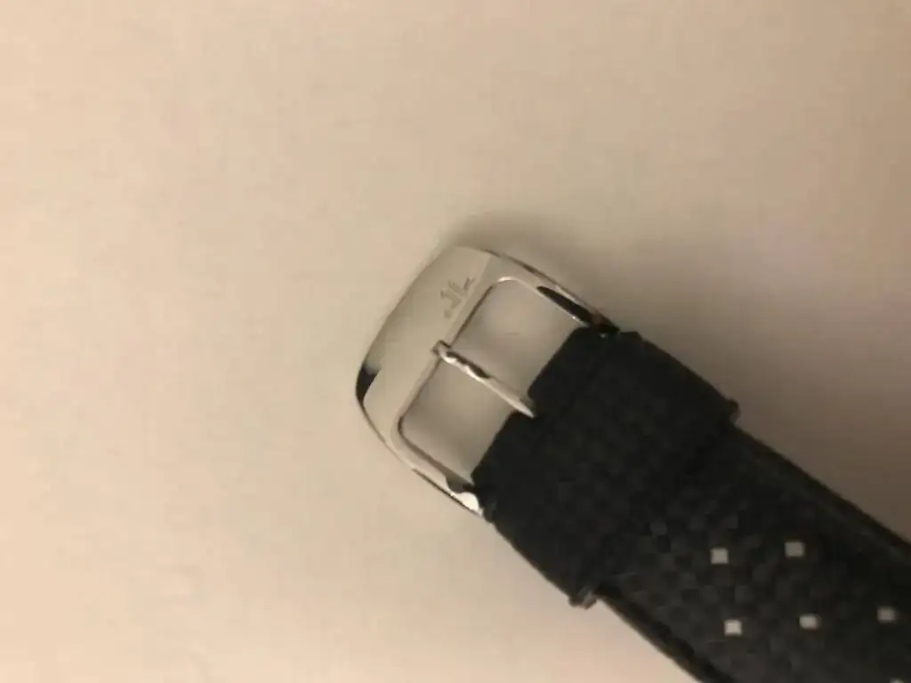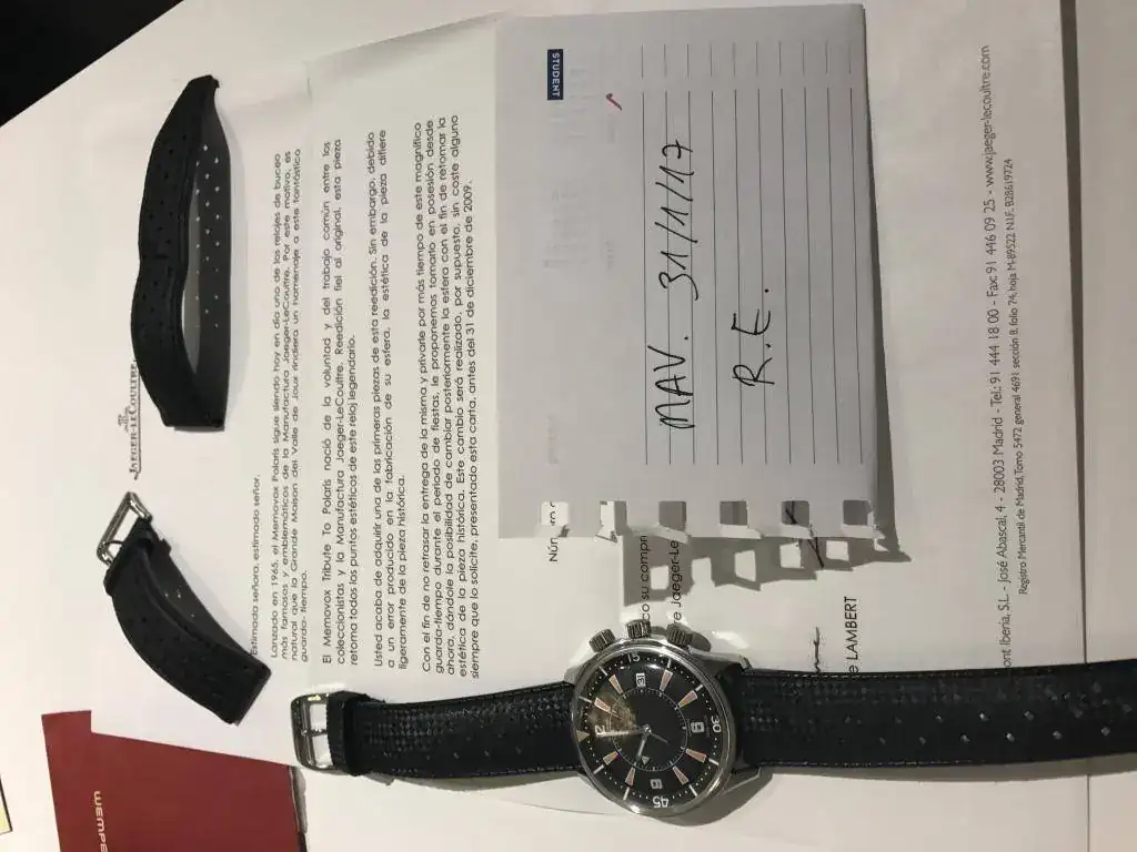A la correa de cuero original se le rompió una de las dos trabillas al poco tiempo de tenerlo. Yo le compré una Tropic de caucho original NOS (la que llevaba el modelo de 1968, bastante cara y difícil de encontrar en su medida de 22mm). Adicionalmente, se le cambió en su día la hebilla de serie por una firmada JLC de 18mm. Incluyo ambas hebilla y correa de origen también.