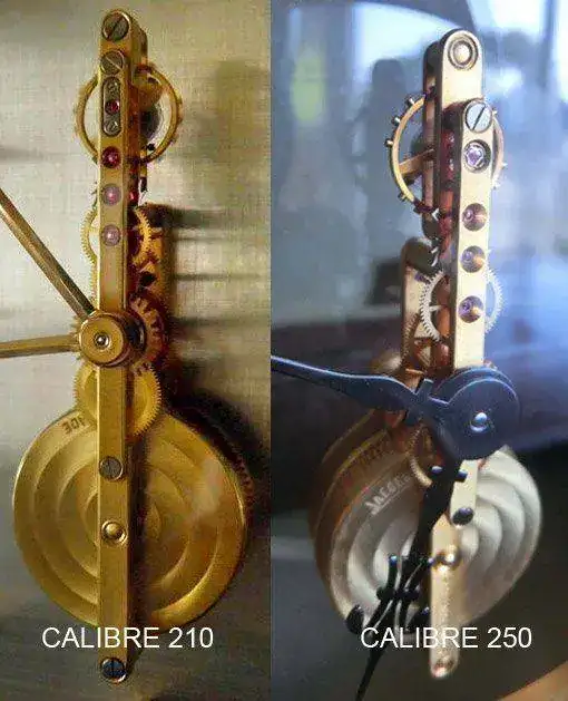 Se hicieron múltiples variantes de varios estilos distintos pero pieza en cuestión es el modelo denominado 215.023, fabricado al final de los años 80 y vendido a mi familia a principios de los años 90. Tiene un calibre 250 de 16 Joyas, de carga manual. Este calibre fué la actualización del 210 utilizado hasta los años 70 al que se le introdujo un sistema de resistencia a las vibraciones muy parecido al incabloc en la articulación del balance. He aqui la diferencia entre los dos calibres (la foto de la izquierda es de internet mientras que la foto de la derecha es el reloj en venta)