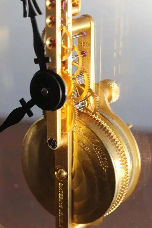 Ya todos conoceis el ATMOS de Jaeger Lecoultre, pero además de este modelo existe otro que Jaeger comercializó desde el 1932 hasta aproximadamente 1990 cuando decidieron descatalogarlo, se trata del primer reloj "skeleton" con máquina a la vista y localizado en una caja originariamente de vidrio (que después empezó a ser de plexi por motivos prácticos). El calibre 210 fué una modificación que hizo Lecoultre a otros calibres anteriores para hacer una maquinaria que fuera lineal y bella de apreciar, también llamada baguette con el barrilete en la parte inferior y el escape batiendo en la parte superior. Fué una máquina revolucionaria para esa época dada su belleza y fué un reloj muy conocido de Jaeger Lecoultre. El ATMOS en comparación es un reloj muy delicado y por ello no es adecuado ponerlo sobre una mesa de trabajo que transmiten frecuentes vibraciones ocasionales, en ese caso este reloj no se ve afectado y es un calibre muy resistente, y tiene muy poca necesidad de mantenimiento dada la simplicidad de su calibre. Por ello se ha quedado para la historia como el reloj de mesa por excelencia de Jaeger Lecoultre.