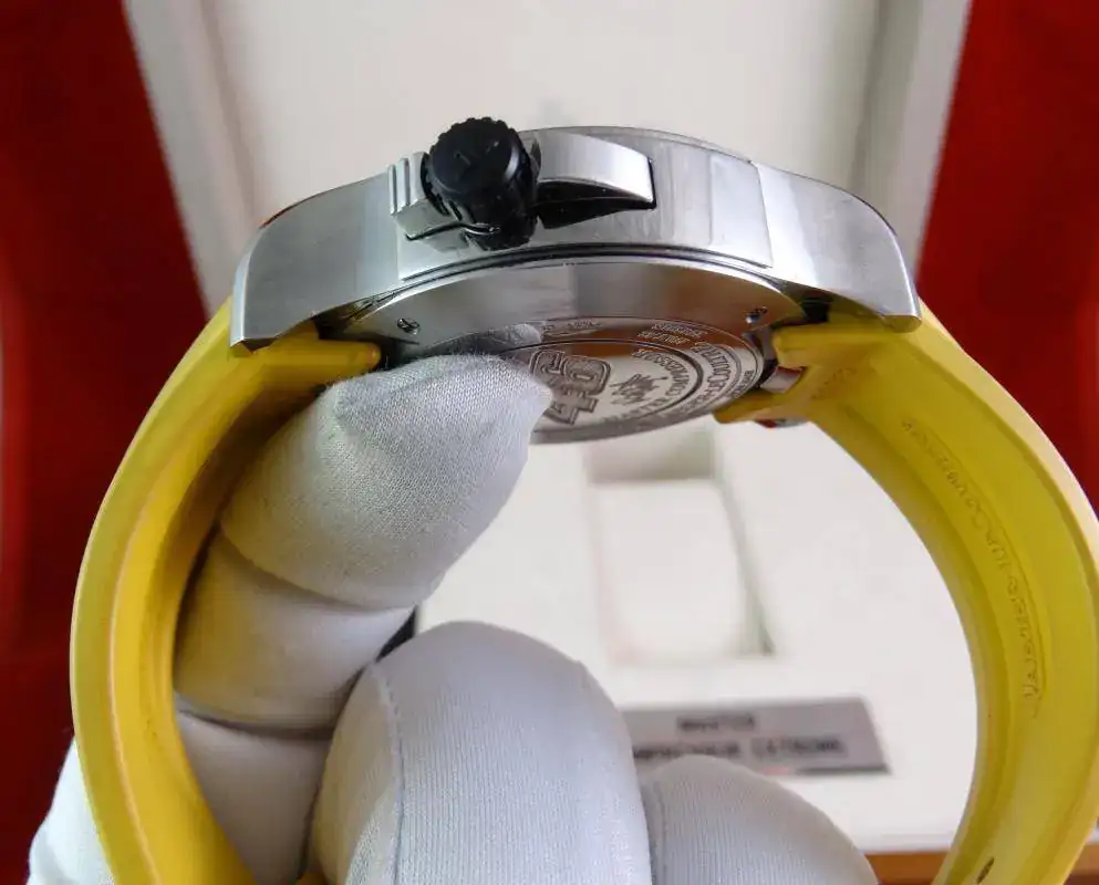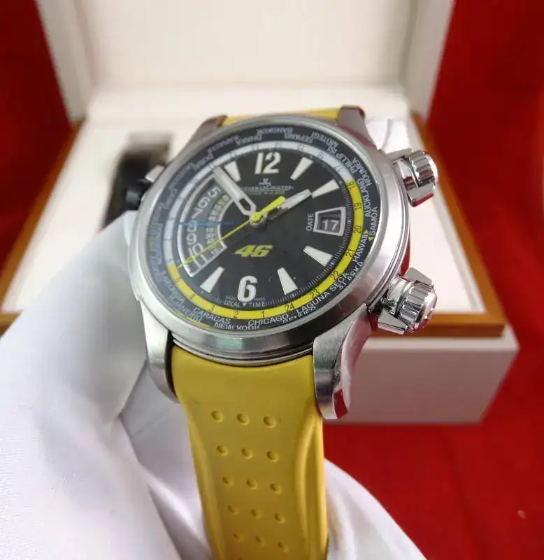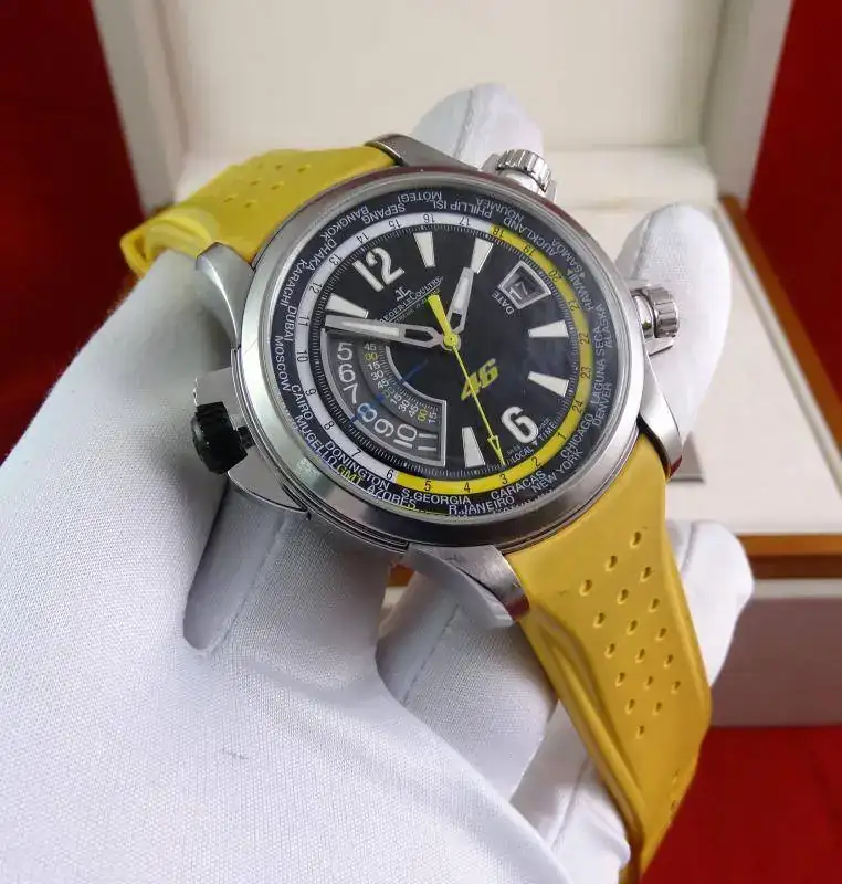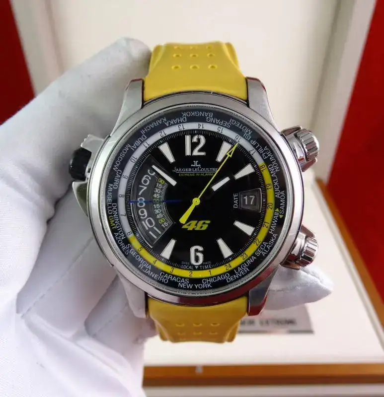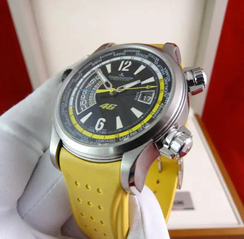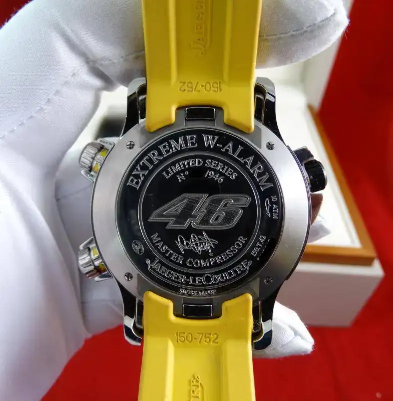 La alta relojería rinde homenaje a uno de los grandes del Motociclismo con esta edición limitada Valentino Rossi de uno de los relojes más espectaculares de JLC en su gama Master Compressor; El Extreme World Alarm es un espectáculo de la relojería, no solo por el calibre manufactura sino también por la encantadora complicación de la alarma mecánica, la cual dispone de un pulsador para activarla y desactivarla independientemente de que ésta tenga carga completa.