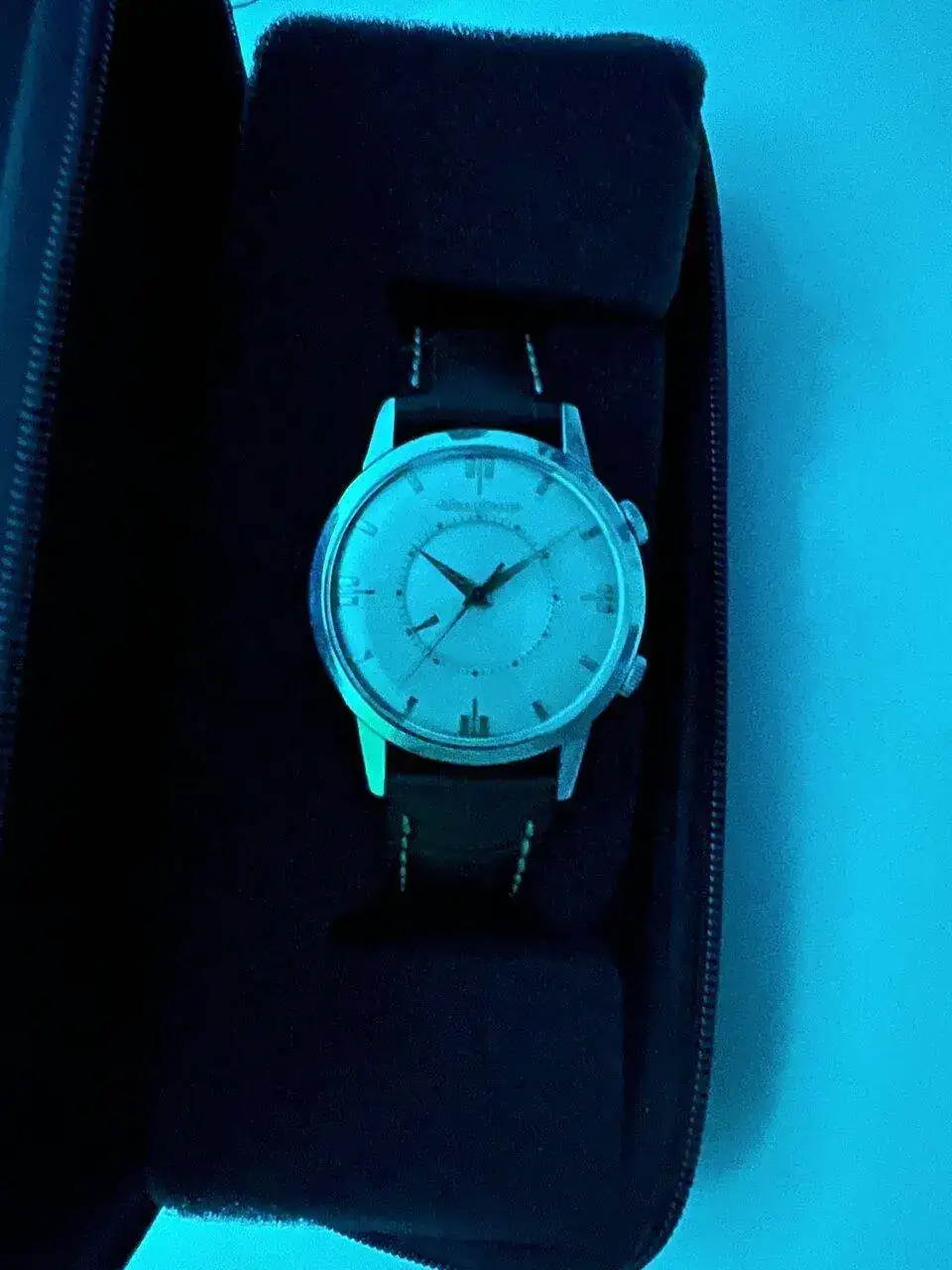 Vienen algunas pieza y otras han de salir. Saco a la venta este Jaeger LeCoultre Memovox. Todo original Jaeger, movimiento, esfera, agujas, la tapa es Original Jaeger perteneciendo la numeración 985353 a un Mignonette. Agujas dauphine, la segundera en azul fuego es preciosa verla trotar en persona. Calibre Jaeger LeCoultre 814. Funciona perfecto. 35 mm sin contar coronas. Las coronas están firmadas con el logo Jaeger. La correa es de cuero marrón y pespuntes beige genética con deplo a estrenar. Se entrega con la de caja de viaje Rabat que ves en las imágenes. La alarma al igual que el reloj funciona perfectamente.
