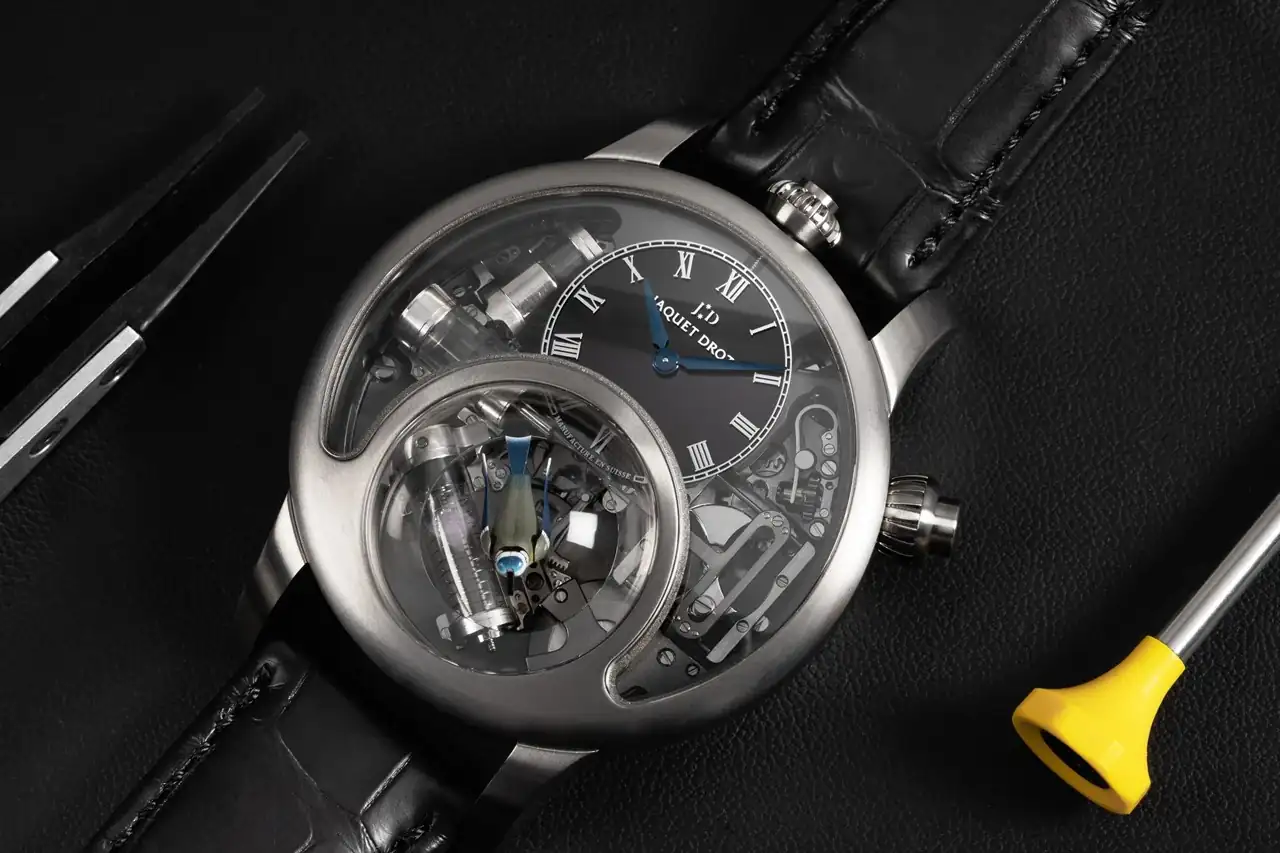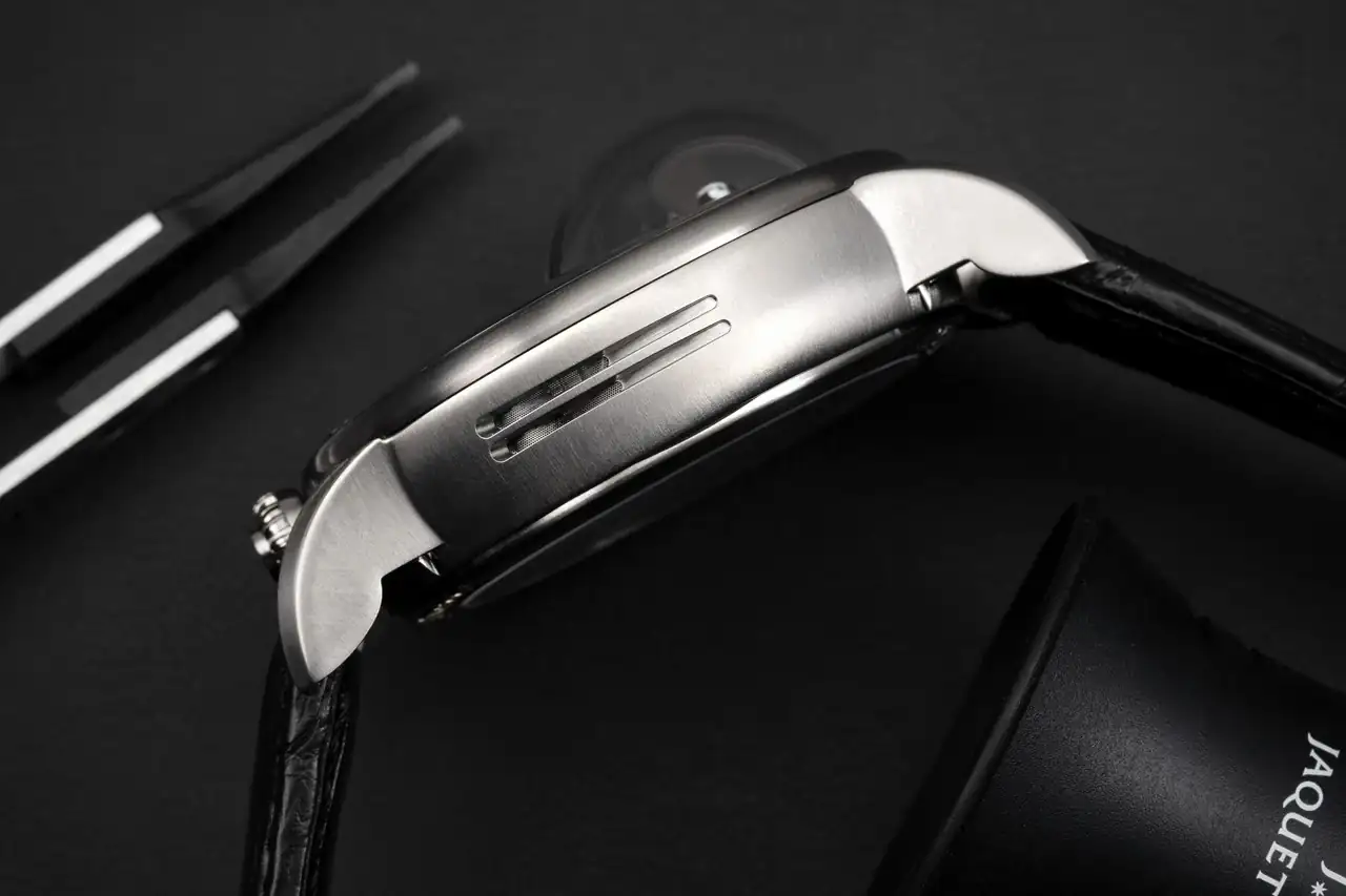 a pesar de estas dificultades, Jaquet Droz ha conseguido preservar la distintiva geometría de su caja, que tiene dos características únicas. En primer lugar, un doble cristal de zafiro en el lado de la esfera protege el movimiento y, por otra parte, a las 6 se sitúa el pájaro autómata. Luego hay una fina abertura lateral, entre las 8 y las 10, que permite que el aire —y, por tanto, la melodía— circule desde el interior de la caja hacia el exterior.