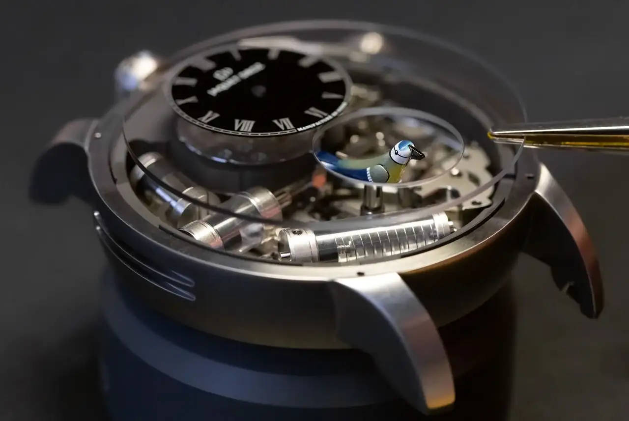 Pocas veces se ha interpretado tan acertadamente la filosofía Disruptive Legacy. En 2025, 10 años después de su coronación en la categoría Excepción Mecánica en el GPHG, el Charming Bird se reinterpreta en una caja de titanio de grado 5, el primer reloj de pulsera con autómata musical fabricado en este duro metal. Considerado uno de los metales más difíciles de trabajar, con una desafortunada tendencia a prender fuego a las herramientas que intentan domarlo, el titanio se había resistido durante mucho tiempo a las técnicas de mecanizado, acabado y decoración. A cambio, ofrece ligereza y una gran resistencia a los golpes.