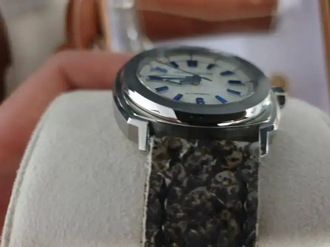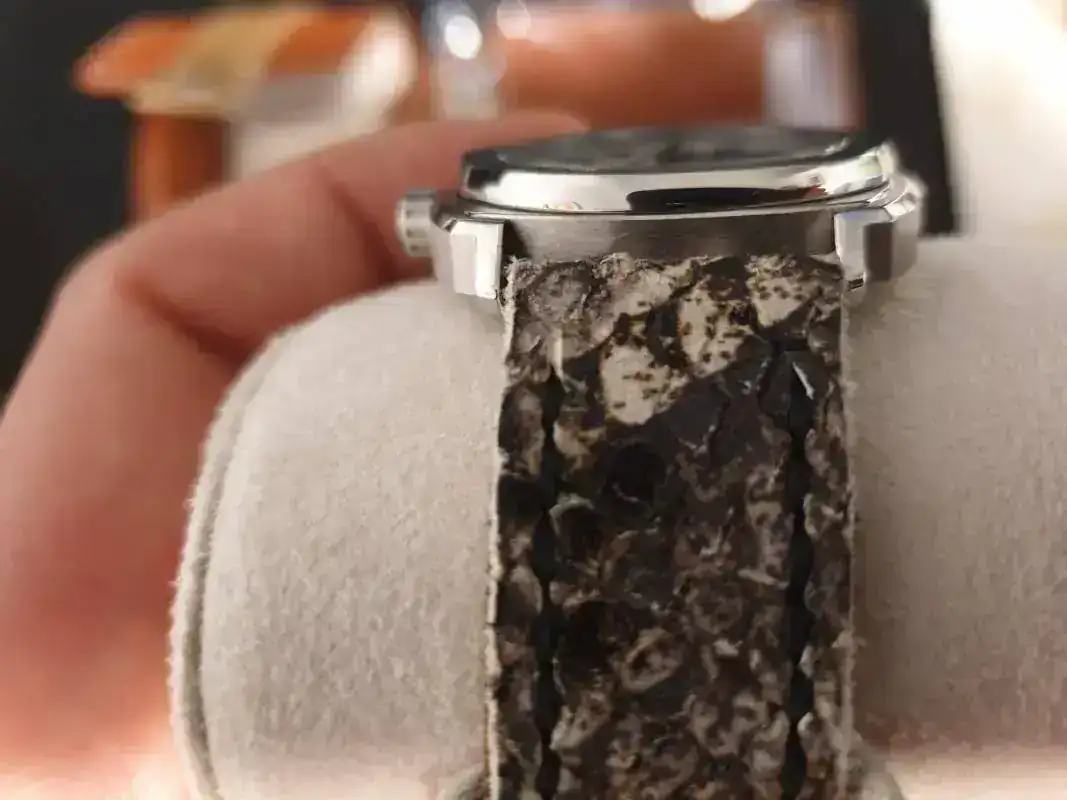 Esta practicamente nuevo excepto unas marcas en las esquinas del armis y en la caja oculta por la correa o el armis. Le añado de extra una correa de cuero que imita piel de piton.