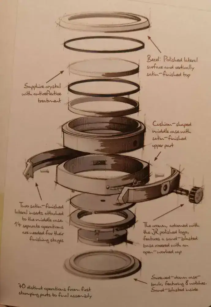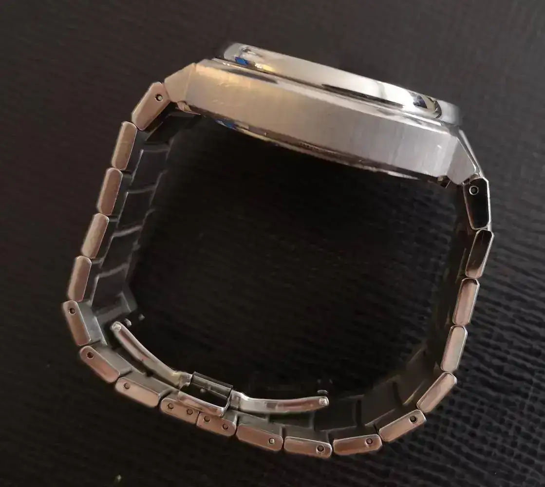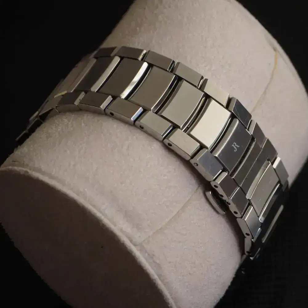 Creo que a nadie se le escapa la calidad de este reloj, con una robusta y compleja caja tipo cojín que alterna superficies pulidas con otras con satinado vertical y un brazalete en acero también magníficamente terminado en el que los eslabones, satinados, tienen los bordes biselados y pulidos. El fondo es roscado, ciego y grabado con la marca. Se presenta con una esfera plateada/acero que da un aspecto aun más contundente al reloj, pero con un toque elegante.