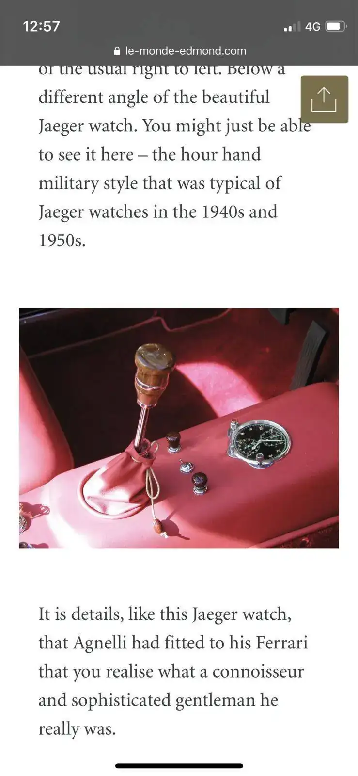 Jaeger le coutre puede definirse como una marca de referencia en la industria automotriz , los grandes iconos italianos ponían sus medidores de presión de aceite y demás de esa marca , incluso un Ferrari hecho a medida para Gianni Agneli (dueño magnate de Fiat) llevaba esos relojes