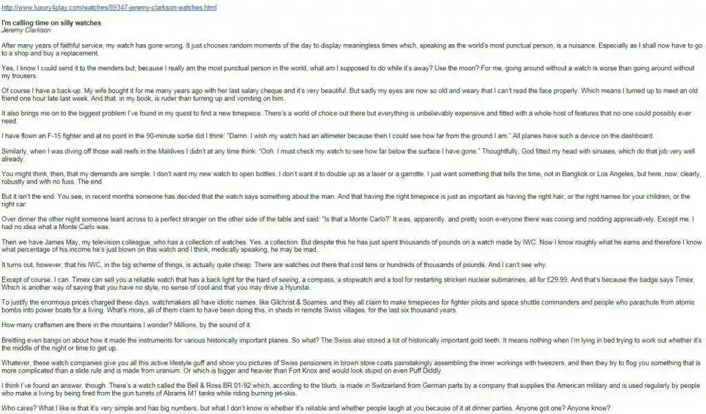 Acá hay otro artículo de Jeremy Clarkson. Empieza con una introducción donde cuenta que se le rompió el reloj, y que no cree que pueda darse el lujo de llevarlo a arreglar, ya para él, que andar sin reloj es como andar por ahí sin pantalones. Luego comenta que tiene un backup, un reloj que le regaló su mujer, pero que no puede leer la esfera correctamente. Es por eso que considera comprarse uno.