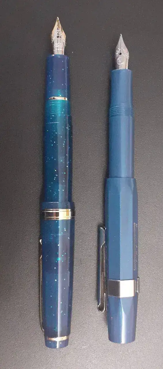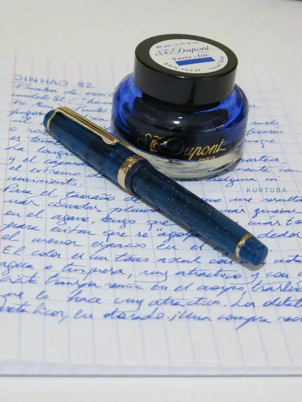 Al final he caído por la madriguera de conejo y una jinhao 82 se ha venido para casa. En color azul (con un ligero matiz azul petroleo), traslúcido con purpurina y tono dorado en los apliques metálicos.