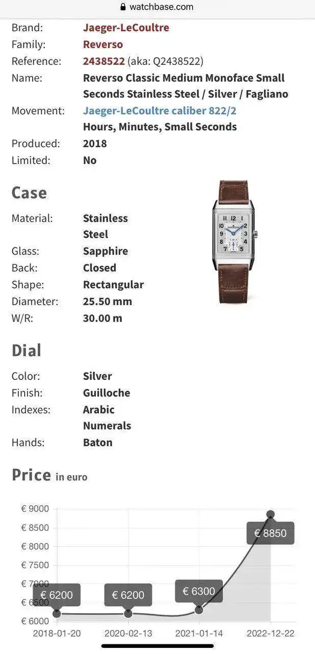 siempre se comentan las subidas de todas las marcas, pero algunas subidas pasan mas desapercibidas... y queria comentar que un Reverso ha subido mas de un 40% en menos de año y medio... Os paso articulo de Fratello donde lo comentan y la grafica (sube mas q los bitcoin en su pico 🤣🤣):