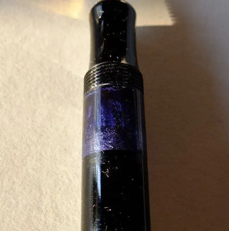 El caso es que el mecanismo del émbolo no funciona. Lógico si además se aprecia que el propio émbolo, de corcho, se ha hinchado y casi rompe la pluma. Tiene una fisura pero no parece grave, yo creo que mantiene estanco el depósito.