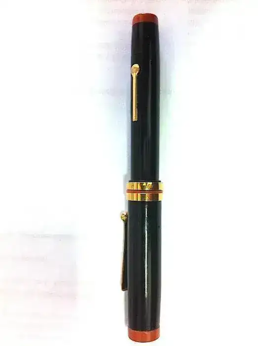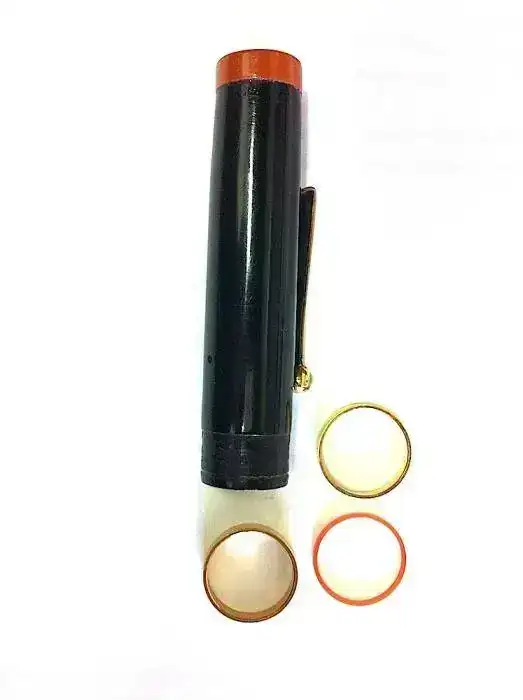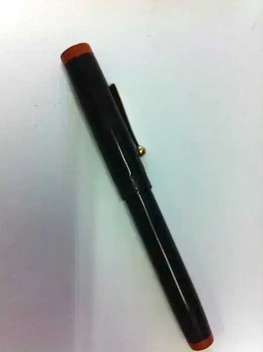 Los extremos son de ebonita naranja y el cuerpo y capuchón yo diría que es baquelita pero no podría asegurarlo y bien podría ser una mezcla de ebonita y celuloide. Es un material muy muy rígido.