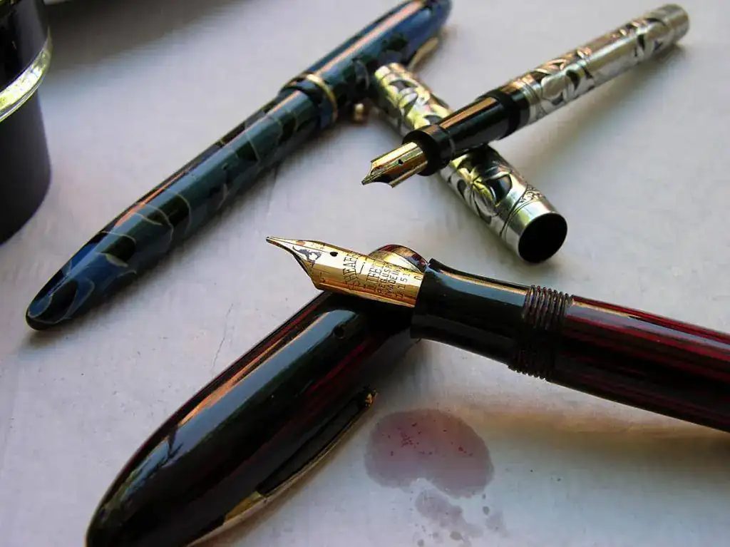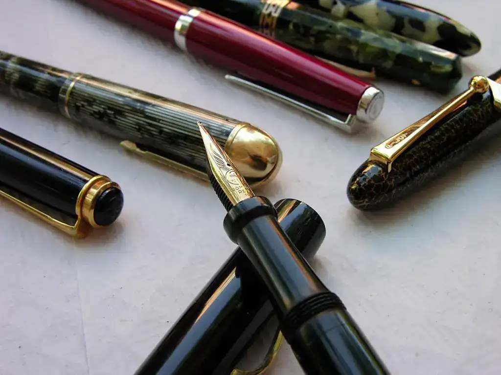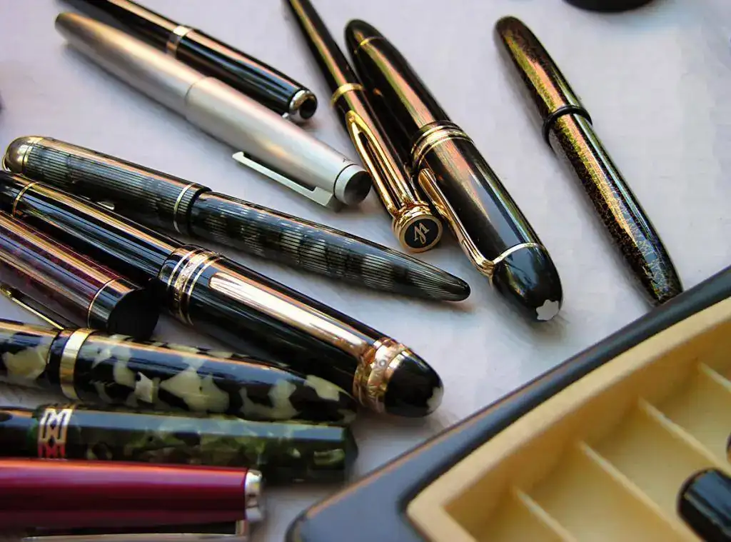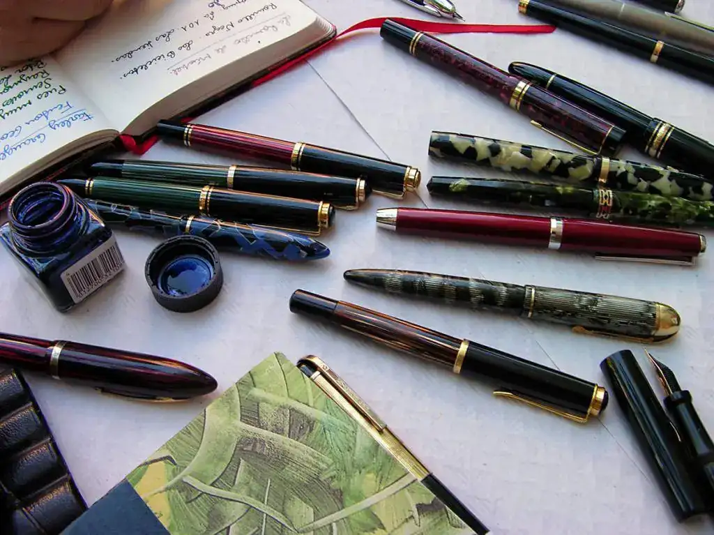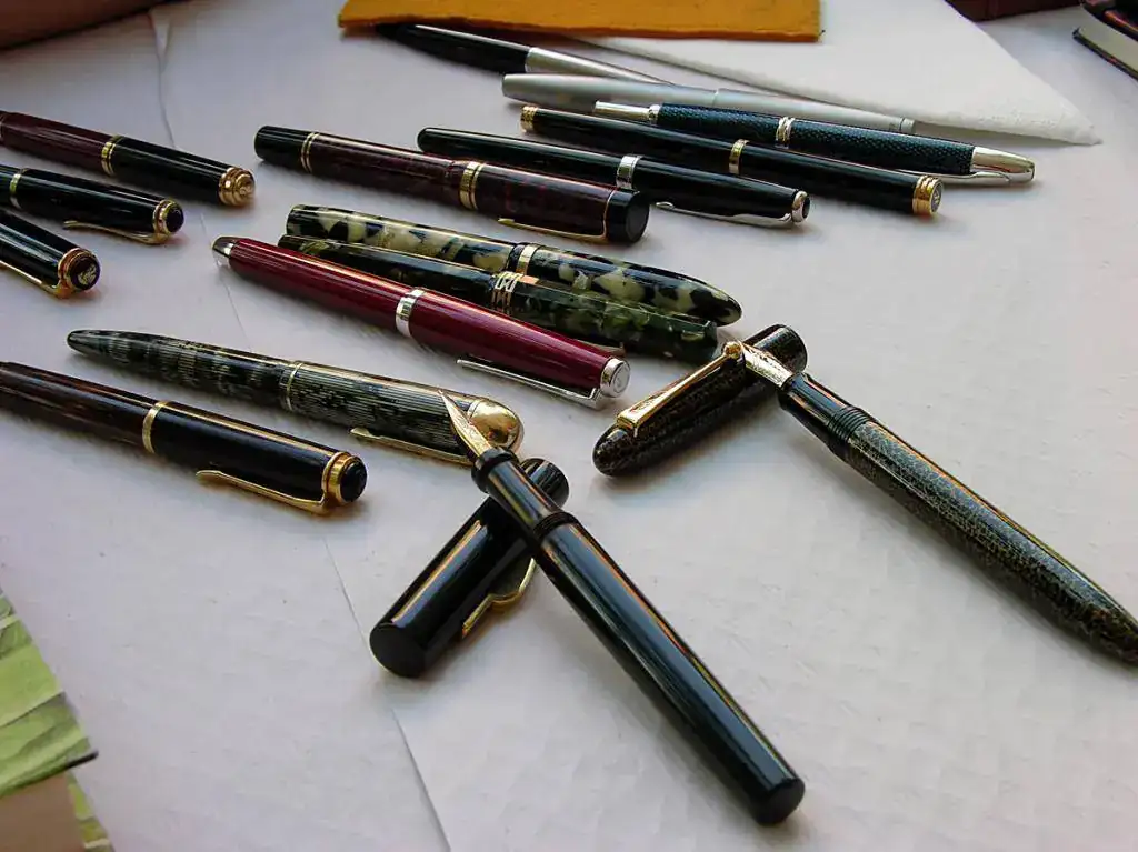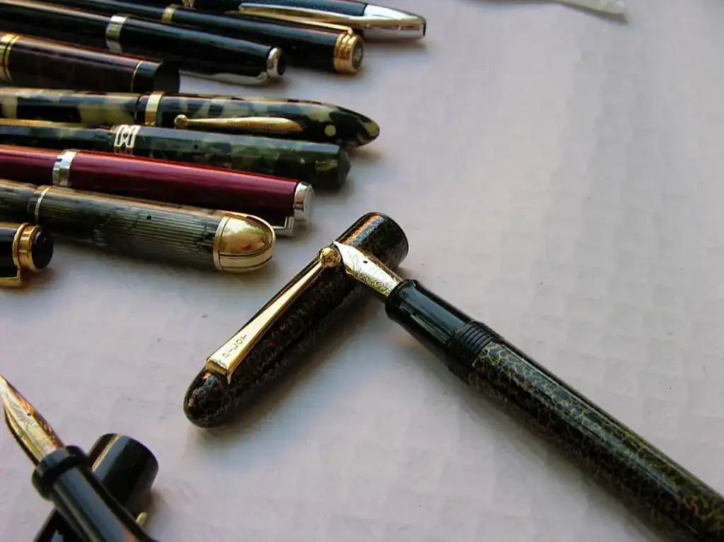 En cuanto a materiales, quizá dominó el celuloide, vistiendo las elegantes Wahl Eversharp Doric con ese fabuloso plumín graduable o la Skyline en versión estriada, calzando las eficaces Pelikan en casi todas sus variaciones y luciendo en las rotundas formas de las Sheaffer. Alguna ebonita en partes indispensables de las Pelikan, bajo la filigrana de la Mabie Todd y como cuerpo entero en la soberbia Romillo. También los acrílicos lucieron sus reflejos en la Parker Duofold roja marmolizada, en las regias Montblanc 149, y en una despistada M250 de Pelikan.