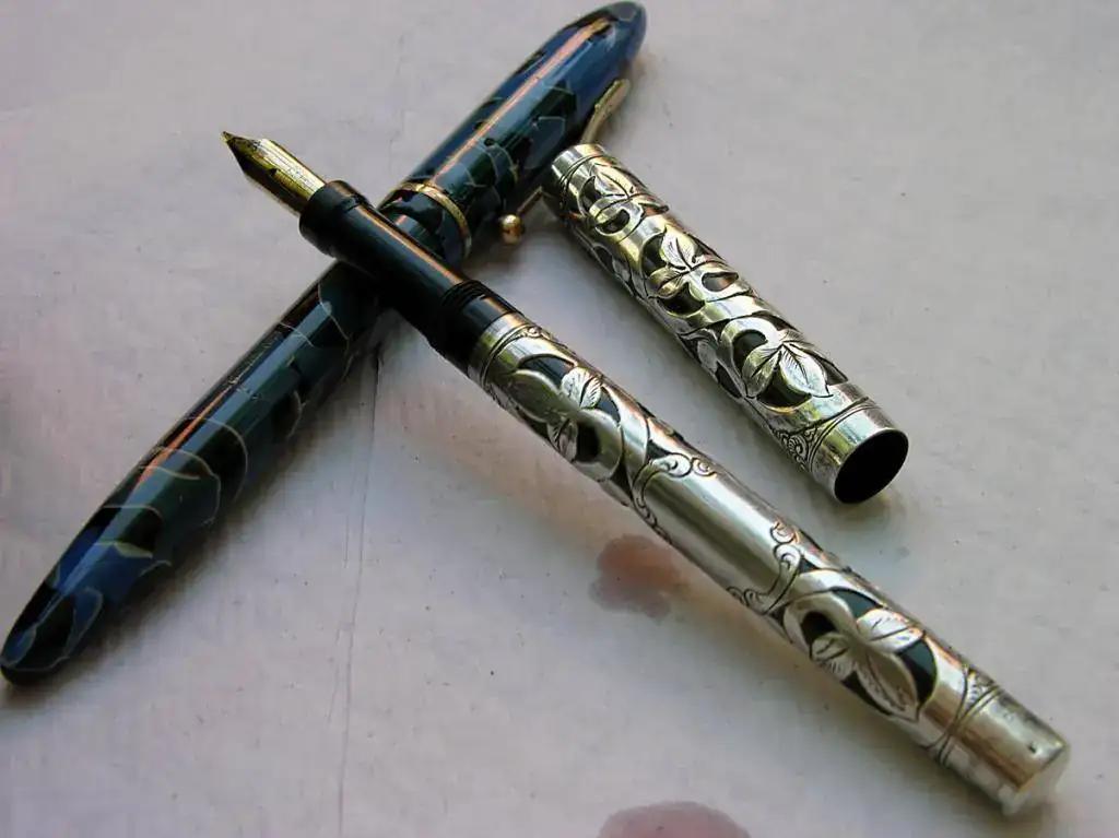 Una de las joyas, por su exquisito plumín, fue la Mabie Todd con acabado en filigrana de plata esterlina, que tuvo muchos pretendientes, pero que volvió a su hogar al no encontrar parangón. En su aparición se codeó con una rara Sheaffer Balance azul de tamaño medio, que estuvo acompañada de su hermana mayor Balance 1000 en bellísimo celuloide rojo estriado.