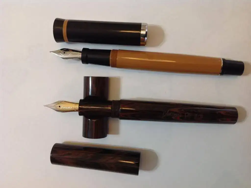 El de oro tiene alimentador de ebonita y escribe mucho más grueso y con mucho más flujo. Es un plumín ideal para firmas, tiene cierta flexibilidad. Escribe muy bien en papeles fuertes como los verjurados.