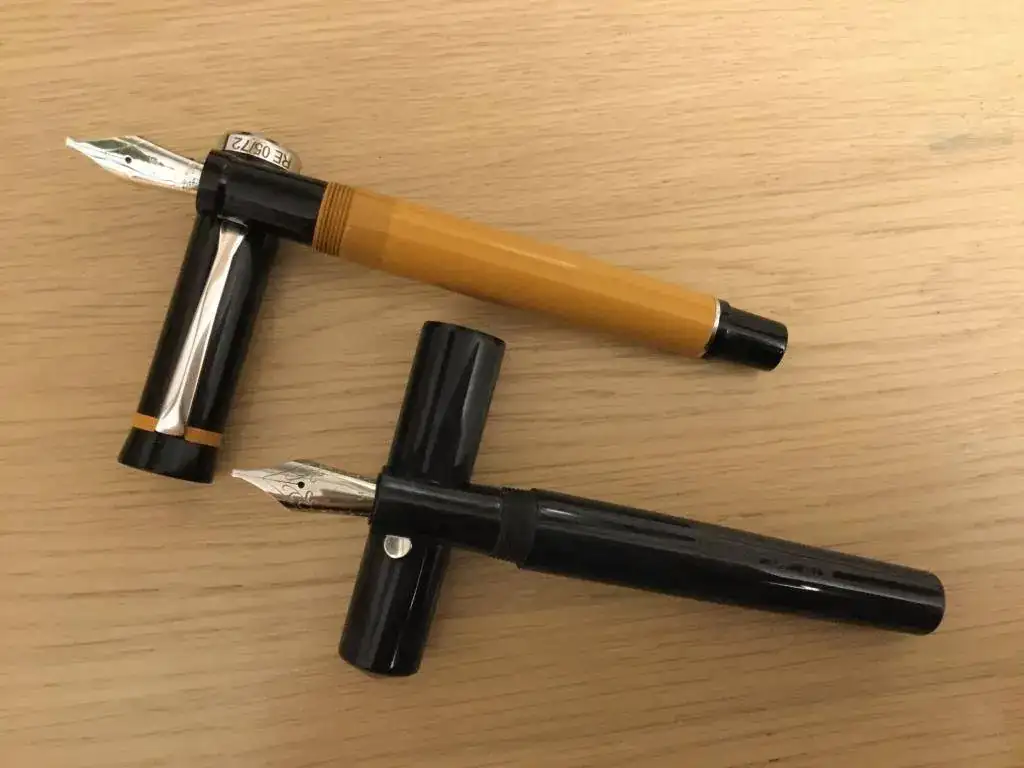 El de acero tiene alimentador de plástico y escribe notablemente más fino. Es ideal para escribir textos y es firme, sin ninguna flexibilidad. Escribe muy bien en papeles suaves como el Tomoe River.