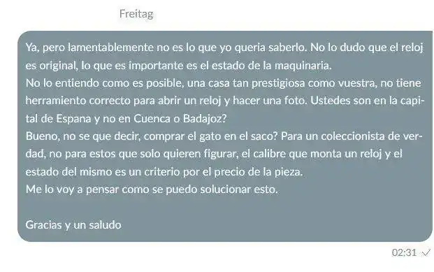 Ese silencio me inquieta mucho.... Si responden pásalo por aquí. No hay relojes difíciles de abrir, por lo que no se por qué se nieganBueno, la mayoria hecho la misma experencia como yo y voy a ponerlo mi pregunta via CHRO24 y su respuesta y la mia despues.