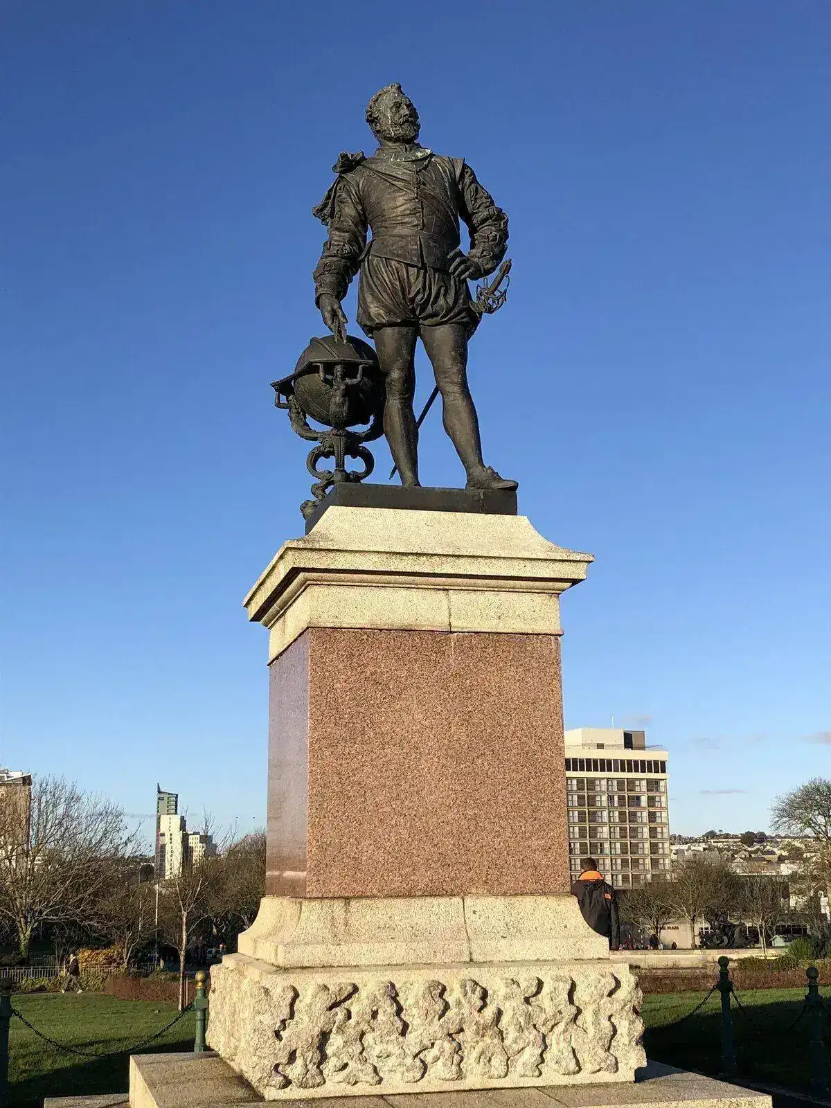 Al lado tenemos la estatua de sir Francis Drake, distinguido hijo de Plymouth. Para ellos , distinguido explorador que comando la primera circunnavegación inglesa del globo, renovador de la marina, y empresario de éxito. Para nosotros pirata, asesino, secuestrador y ladrón. Cada uno cuenta la historia como les fue.