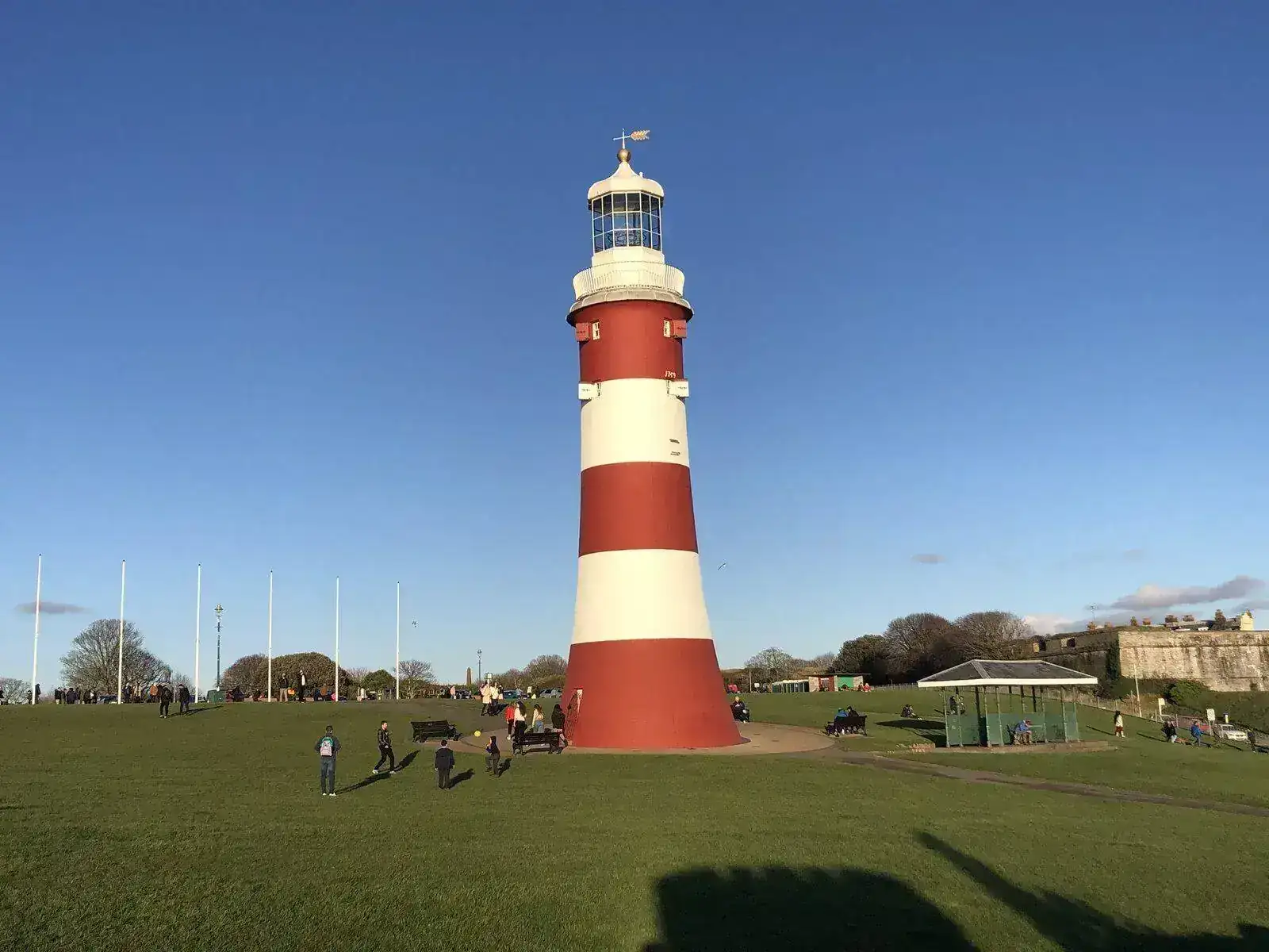 Bajando hacia el mar se encuentra el faro de Smeaton , una gran obra de ingeniería del siglo XVIII que fue instalada en un islote a unas 11 millas náuticas del puerto para servir de ayuda a los navegantes que llegaban a estas costas. En el siglo XIX se construyó una versión más moderna y el faro antiguo se instaló aquí para que pudiese ser visitado y sirviese de anuncio a los barcos que entran en la bahía de Plymouth que ya han llegado.