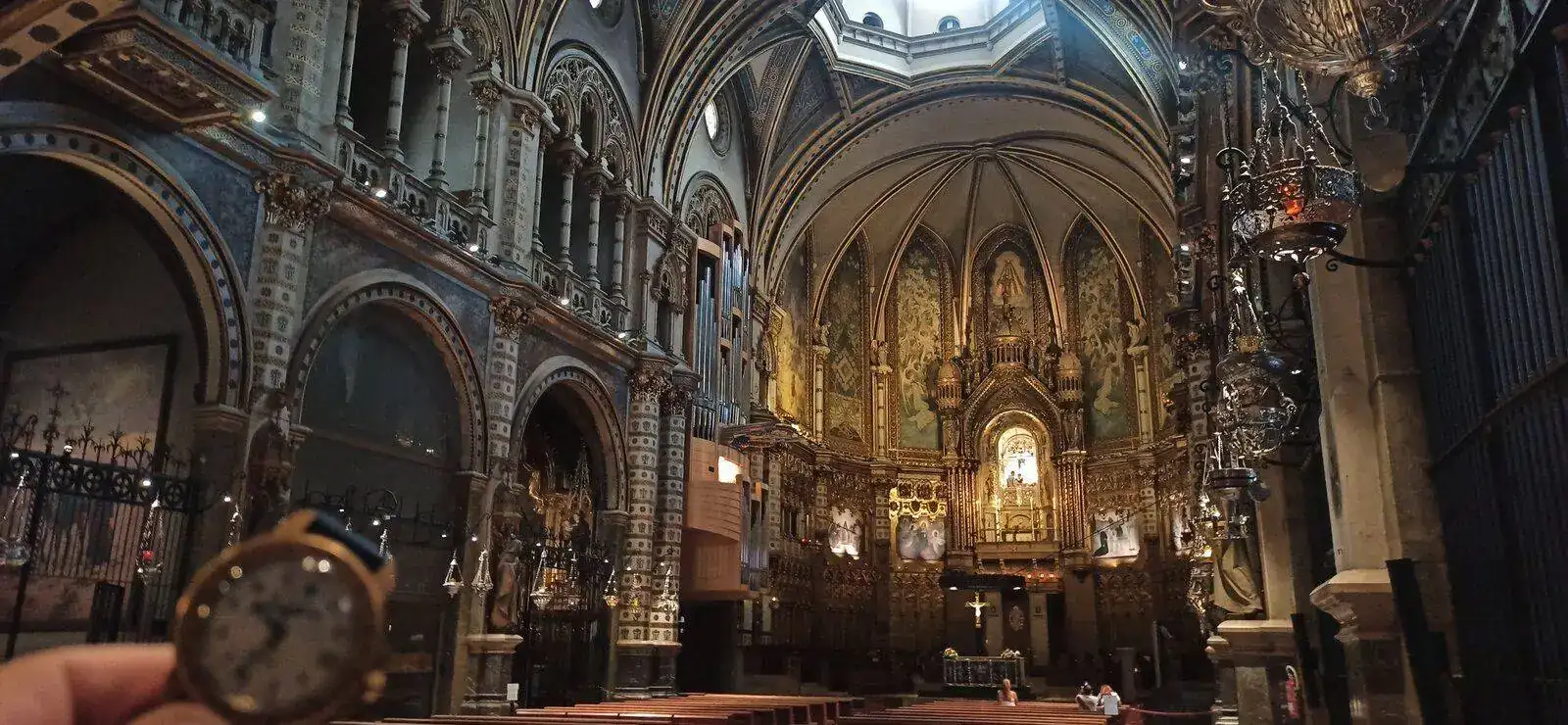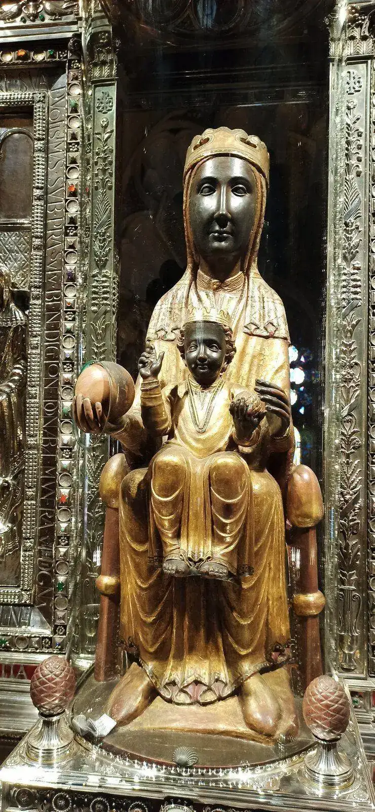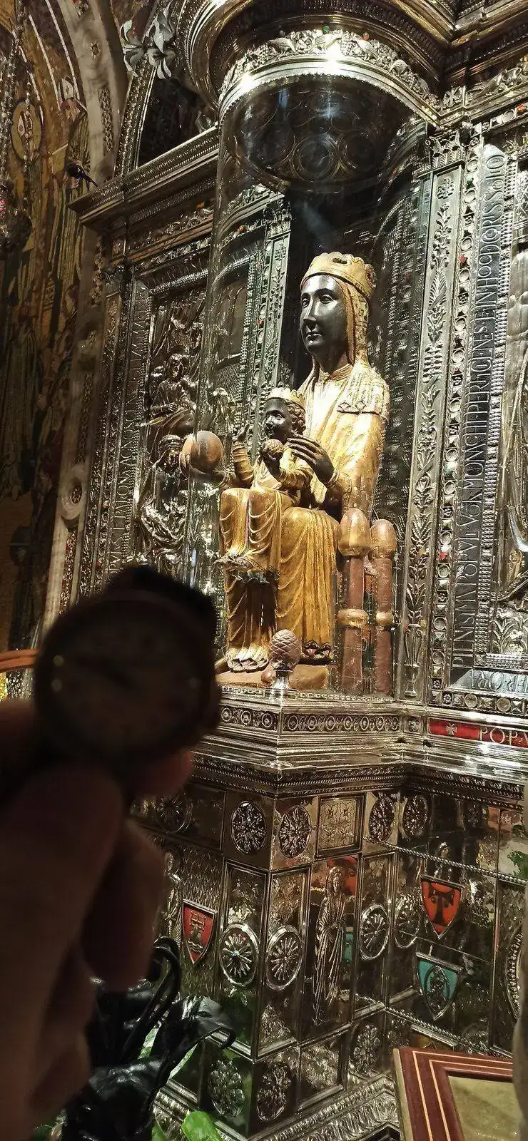 Al entrar, vemos a la virgen al fondo, en alto, iluminada, por encima del altar mayor, por detras hay una escalera, se puede subir a verla de cerca y tocar la bola que tiene en la mano (significa el mundo), ahora no tocar por protoclo covid, luego lo vemos, porque antes de llegar, vemos el impresionante órgano.