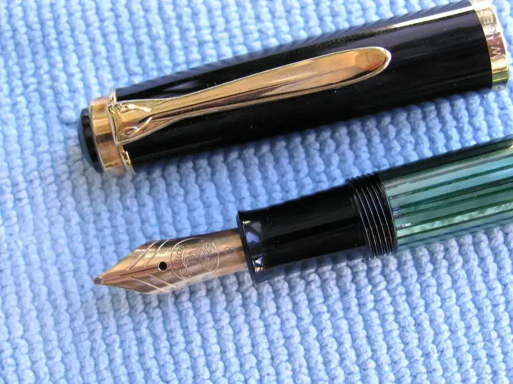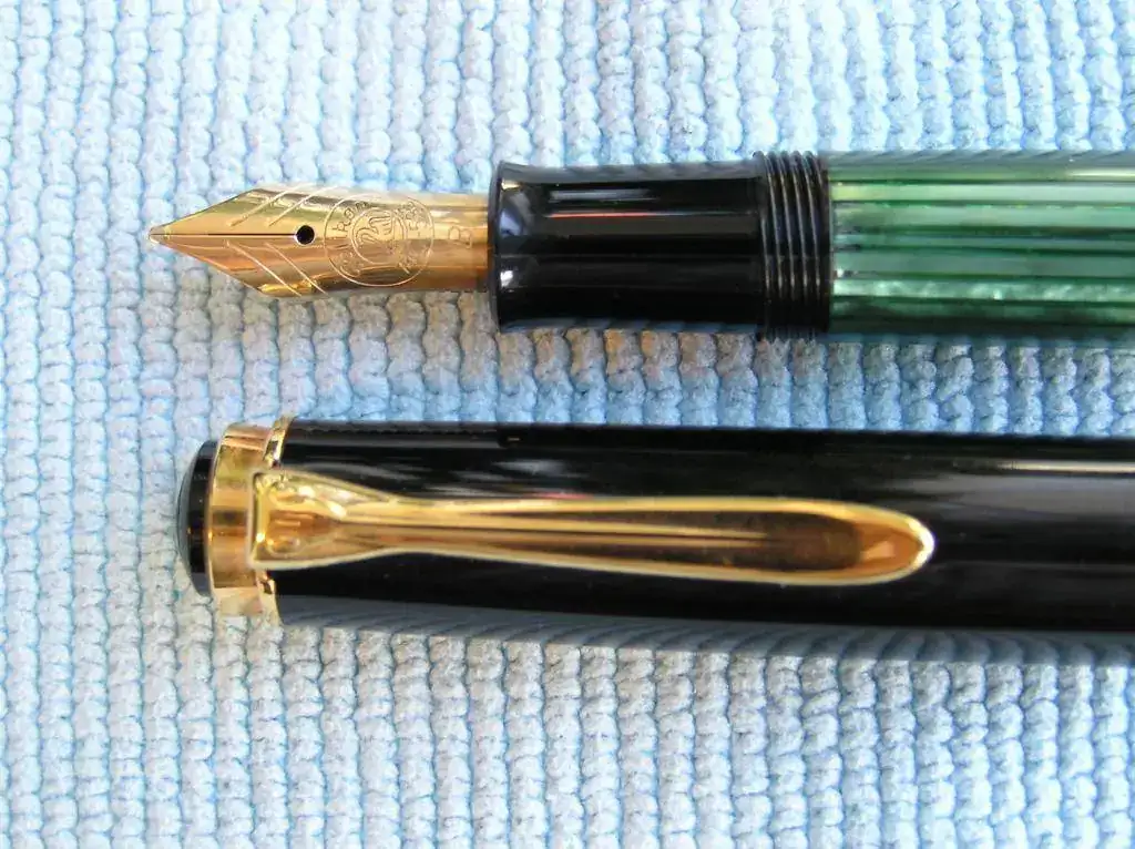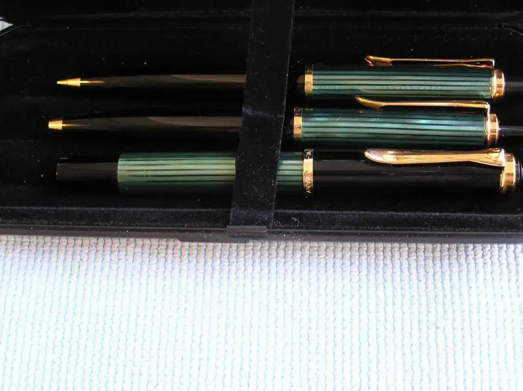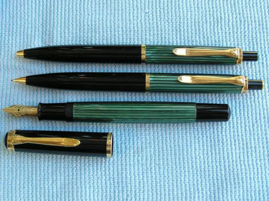 Vendo conjunto Pelikan 400 formado por Pluma estilográfica,bolígrafo y portaminas. El cuerpo de todas las piezas es de celuloide verde estriado combinado con negro. La pluma estilográfica mide unos 12,5 cm. con el capuchón enroscado y lleva un punto B (Broad).