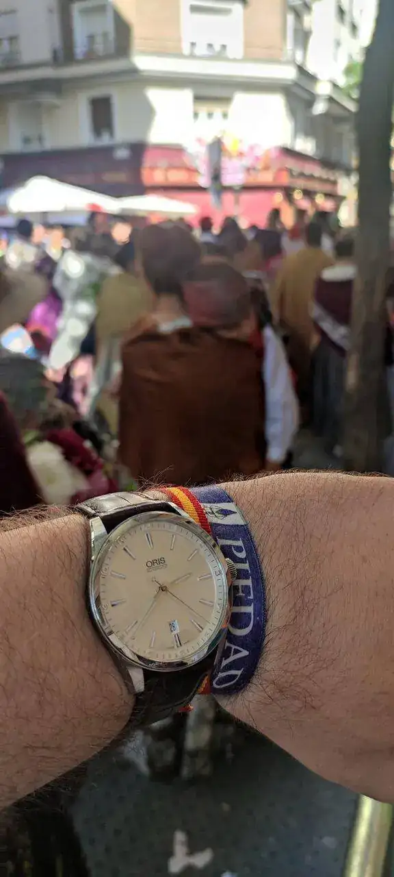 Feliz Día del Pilar, a las Pilares y a todos por ser la Patrona, y feliz fiesta Nacional y de la Hispanidad. Hoy he puesto unos pantalones especiales para la ocasión a uno de mis españolitos, mi Lotus Miyota 3S31, y también me he puesto este Certina que me vino de Zaragoza hace años, el 28-10 de 1963 con esfera de lino.