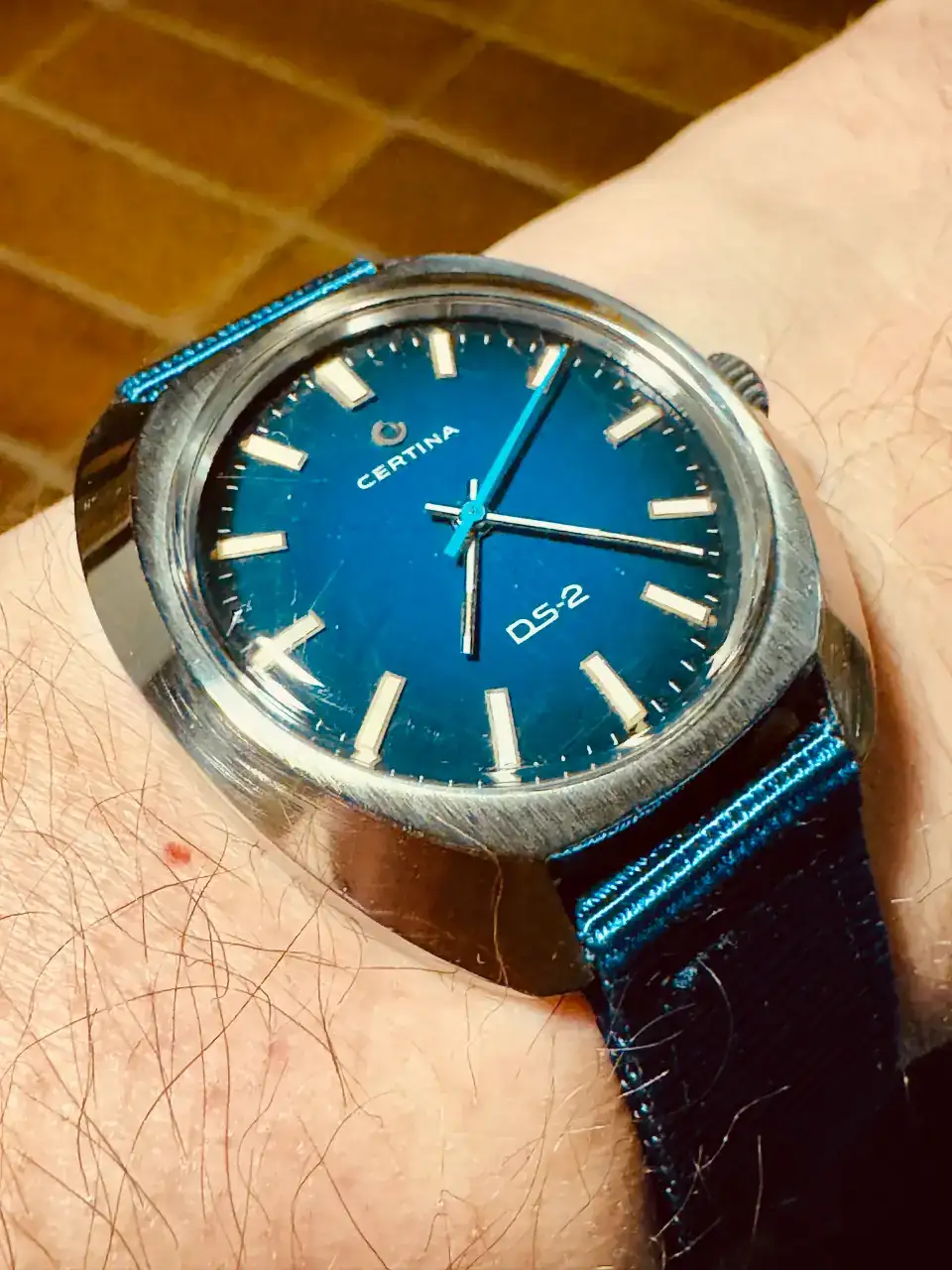 Gracias!. Ciertamente es muy bonito. Hace poco lo llevé a hacerle por primera vez un mantenimiento y funciona de maravilla.DS2 manual, sin fechador y esfera azul.