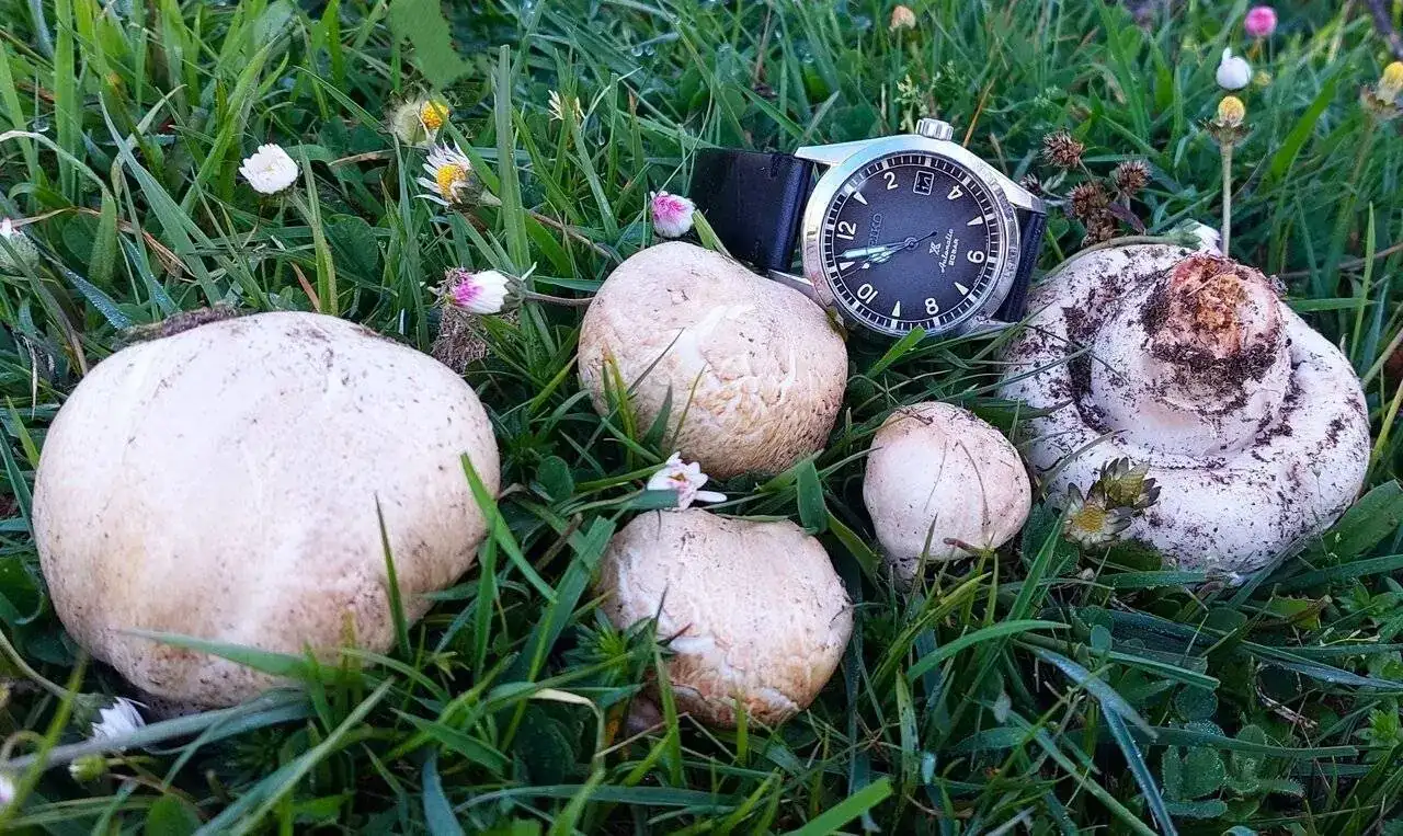 Fantástica.Seiko y Agaricus campestris (champiñón silvestre)