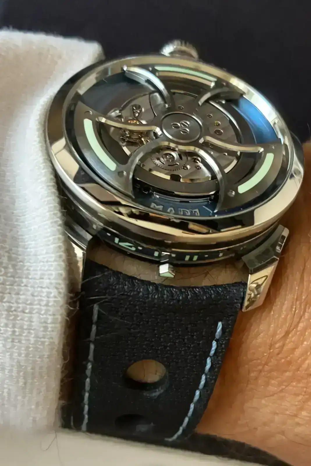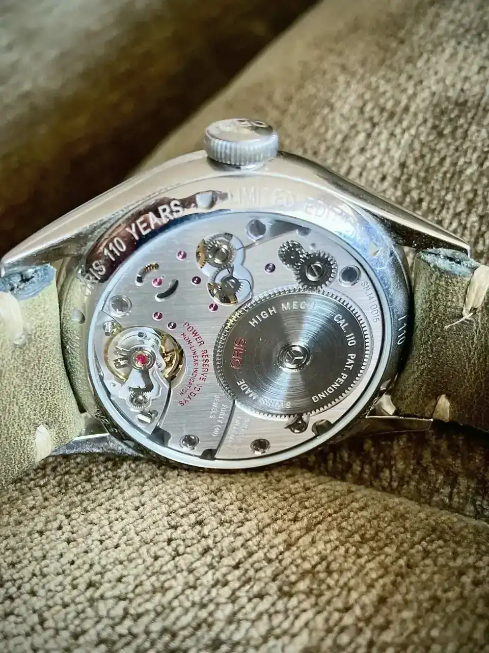 En 2014, al cumplir los 110 años de historia, Oris presentó el calibre 110 (este) al que año tras año han ido añadiendo complicaciones: calendario (111), GMT (112), Fecha y día (113), GMT con medias horas (114), esqueleteado (115)... Vaya, el esqueleteado no es una complicación en sí, pero se trataba de ofrecer algo distinto. De hecho, el diseño original del 110 ya preveía irlo 'complicando' con el tiempo.