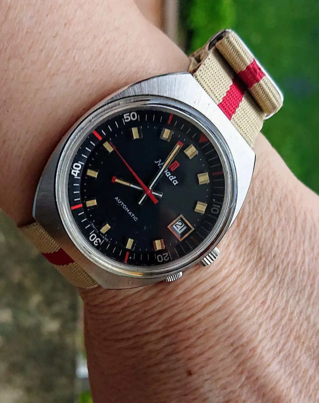 Qué preciosidad de gama de colores de la esfera de este Nivada. El negro, el rojo, el blanco y el crema del lumen de los índices.¡Buenos días! Uno de mis favoritos hoy