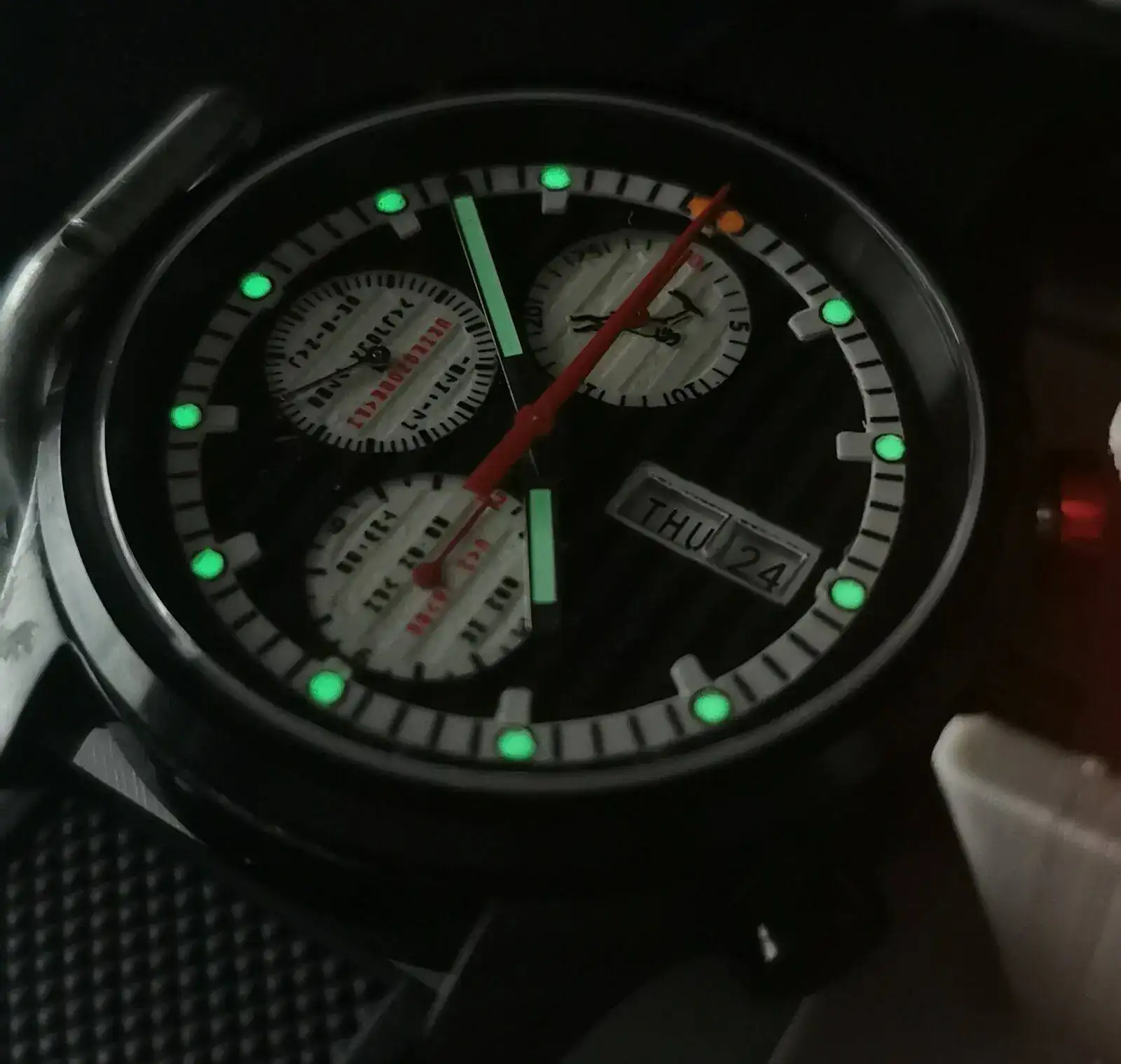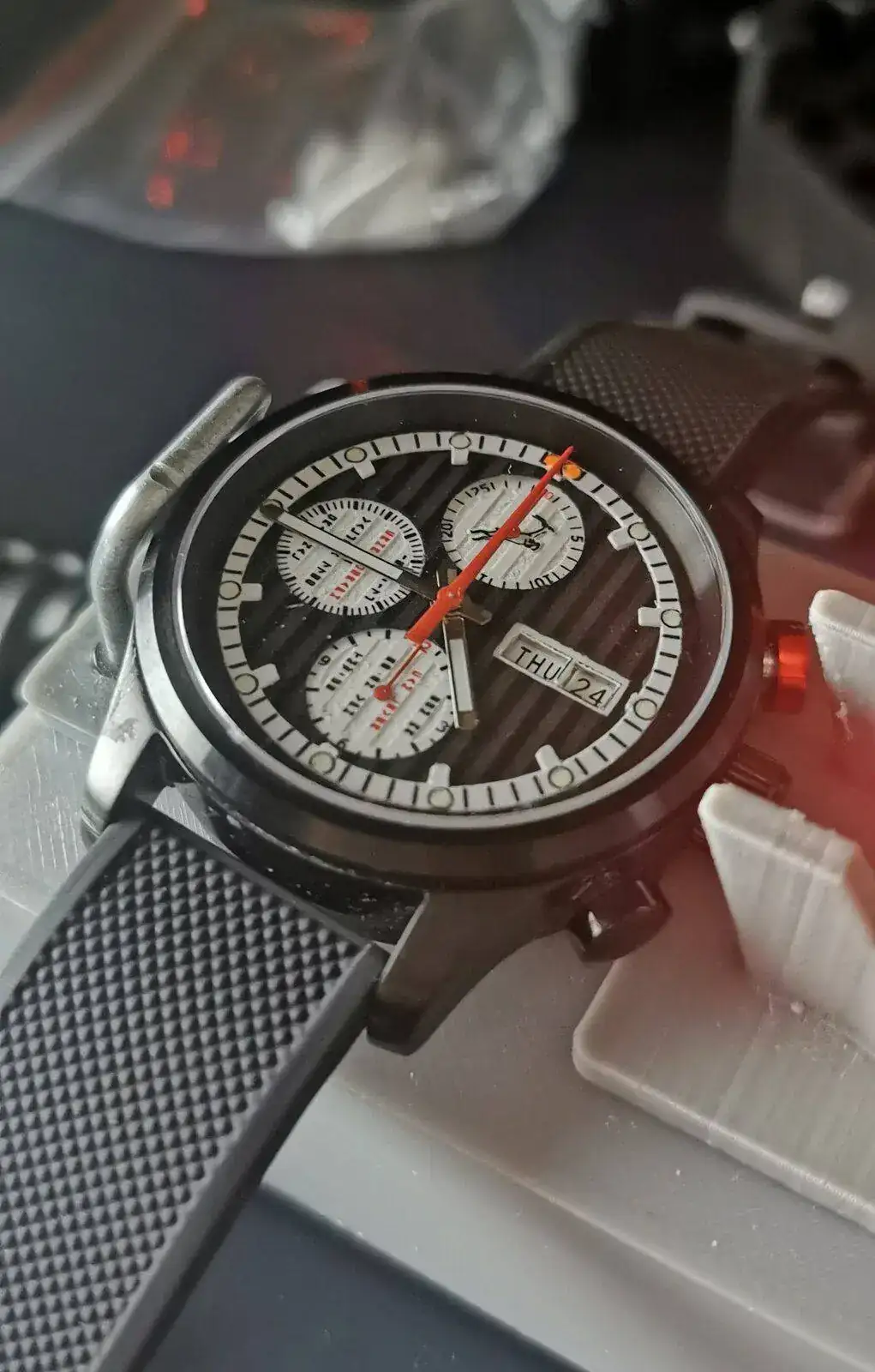 Hoy tocará hacerle el rodaje al último proyecto, y último por un tiempo, de la factoría Kaboom-TMW. Asegurarse de que la marcha en la muñeca se corresponde con lo que marca el cronocomparador, que las agujas no rozan, que el crono corre fino en todo su rango... Y en algún momento de esta semana o la que viene lo terminaré con lo único que le falta, un anillo en el borde de la esfera con subdivisiones de segundo para el crono. O un taquímetro, aun no lo tengo claro. Haré pruebas con los dos.