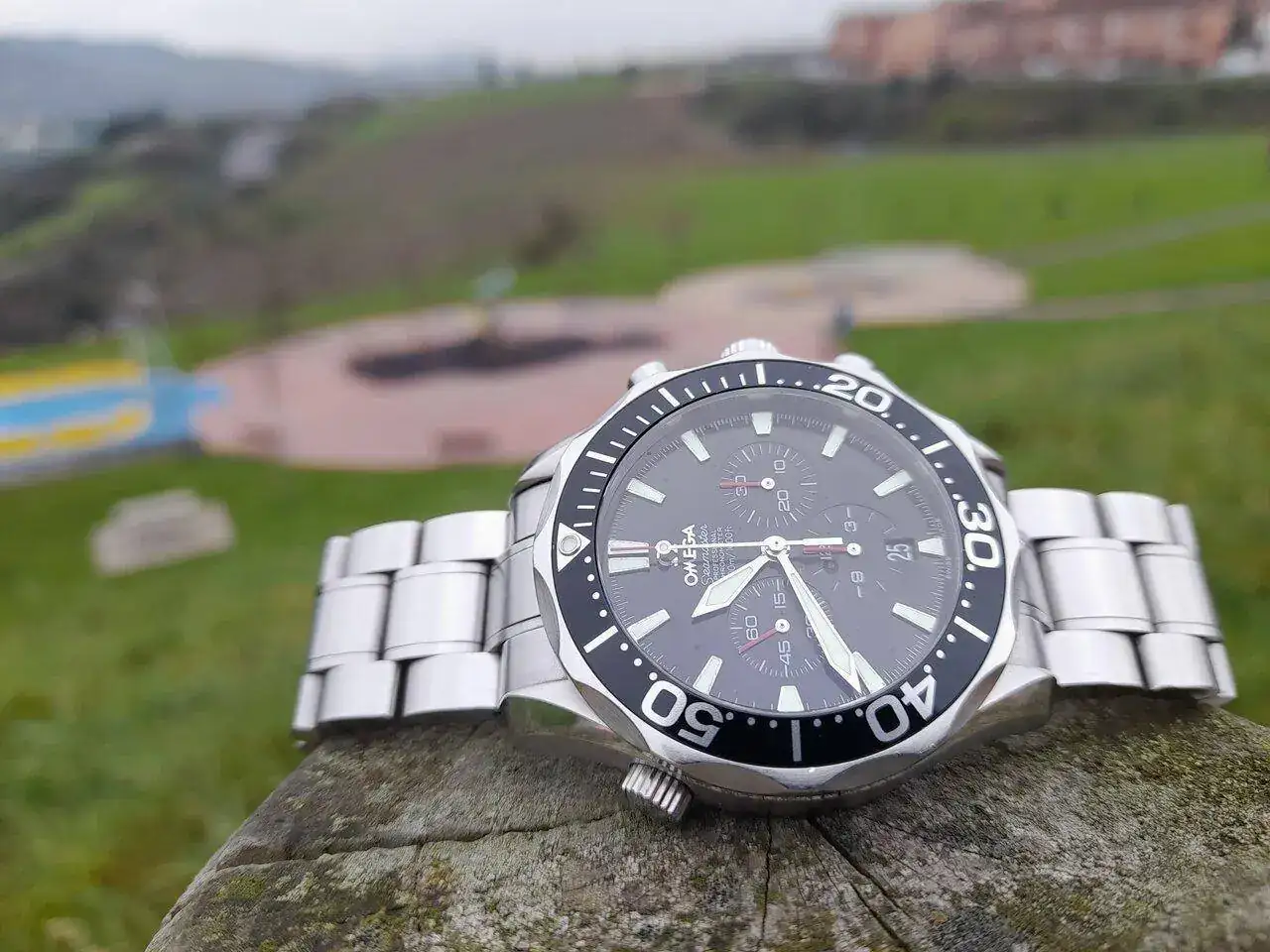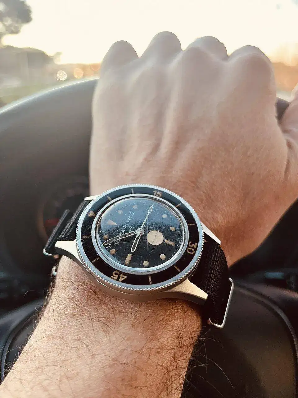 Como cereza sobre la tarta; la condición. Lejos de NOS y lleno de signos de guerra, el plexi machacado, el indicador de humedad activado en el pasado, la nato marcada en la tapa trasera tras mucho uso en cientos de días en el mar… y bajo el sol, una esfera muy tropical.
