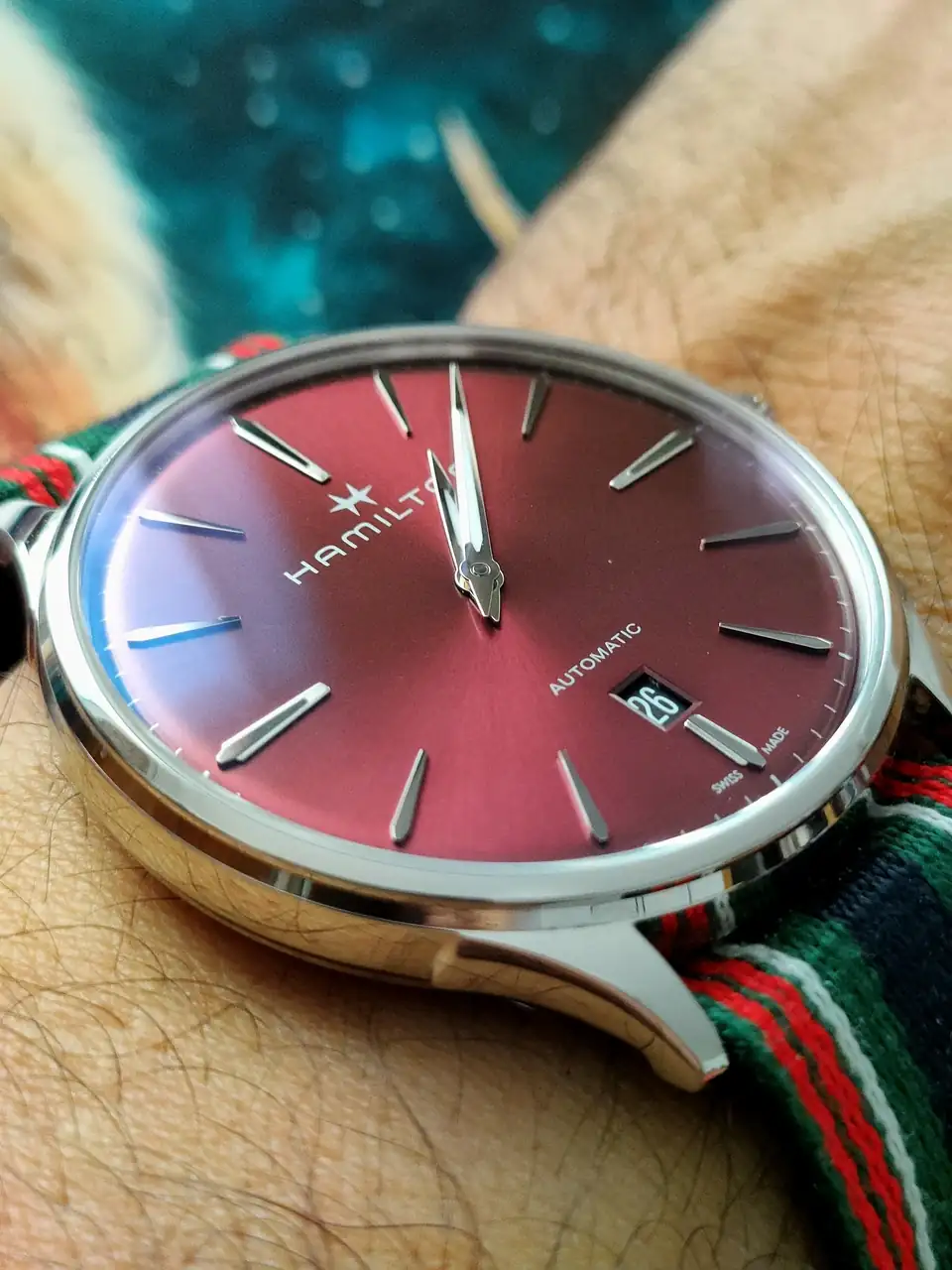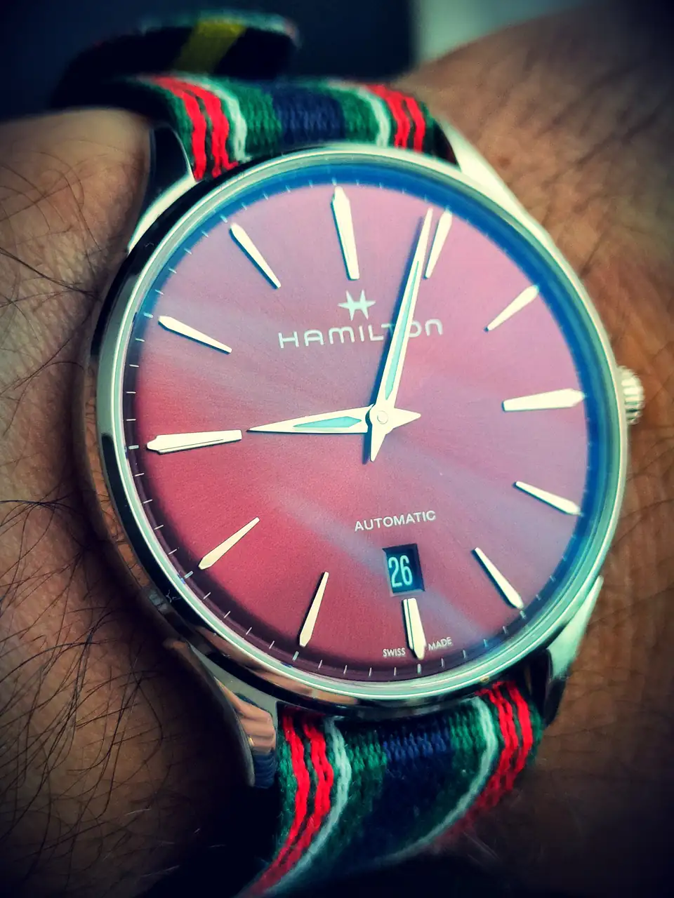 Es bastante singular para ser un Hamilton, la verdad, y quizás sea eso lo que me llama la atención y me atrae de esta pieza... es bonito de verdad, dada la "uniformidad" que Hamilton le da a todos sus modelos. Por eso este reloj me parece tan especial...La esfera es que tiene acabado brillante y depende de cómo refleje la luz parece un color vino o un tono más intenso. Me alegro de que te guste. Saludos